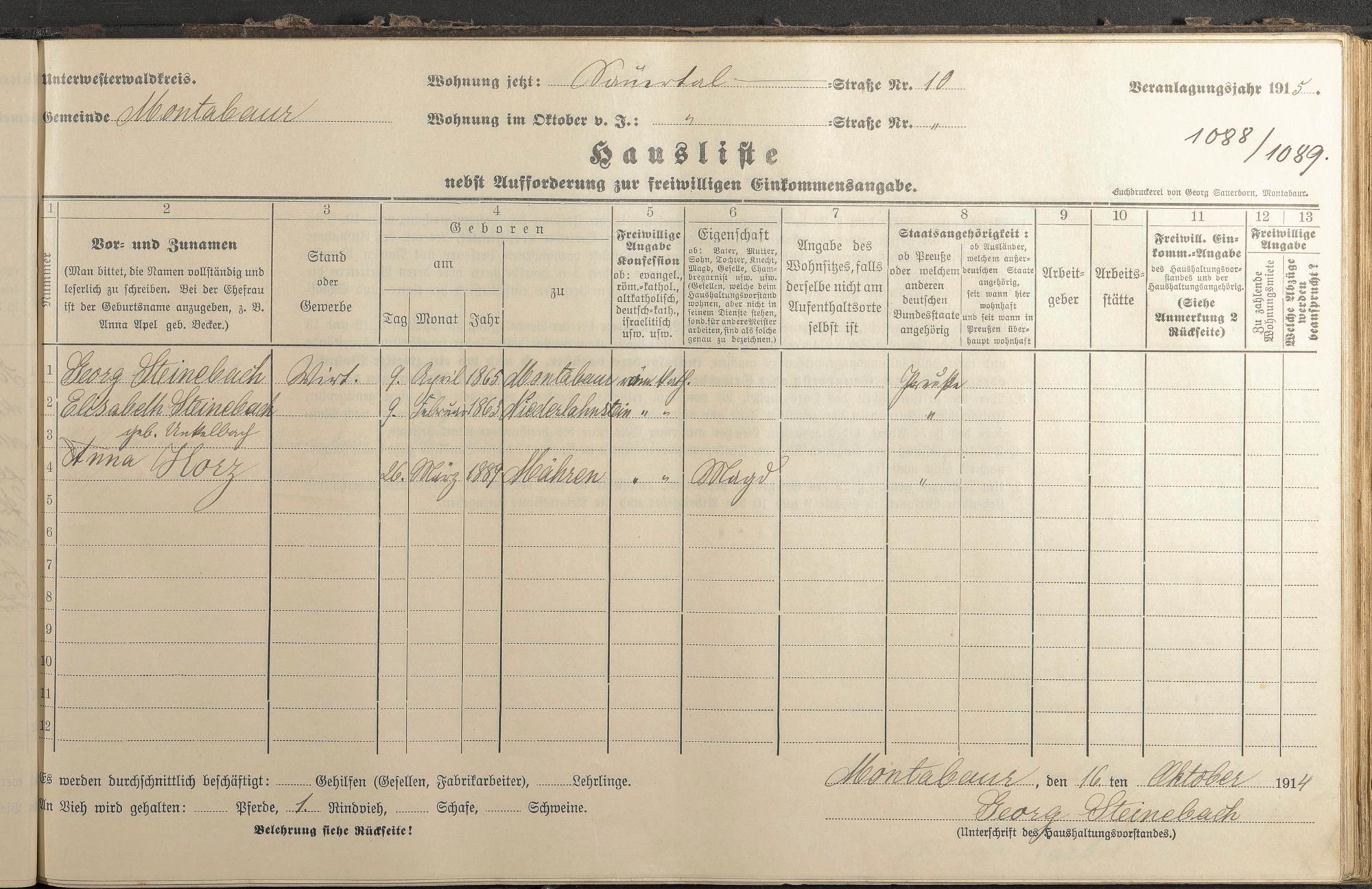 Haushaltsliste 1914/15, Sauertalstraße bis Werbhausgasse sowie Mühlen
