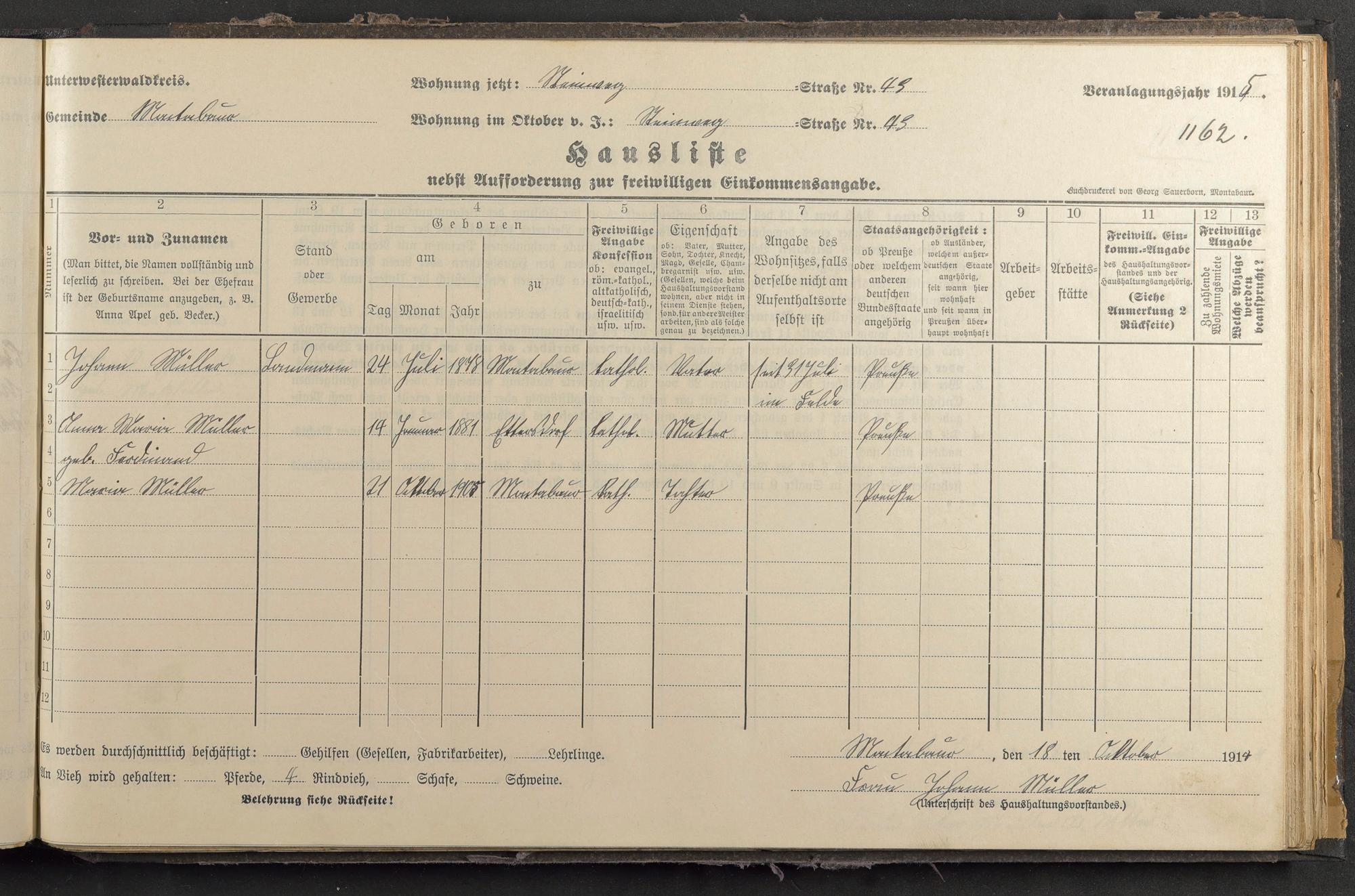 Haushaltsliste 1914/15, Sauertalstraße bis Werbhausgasse sowie Mühlen