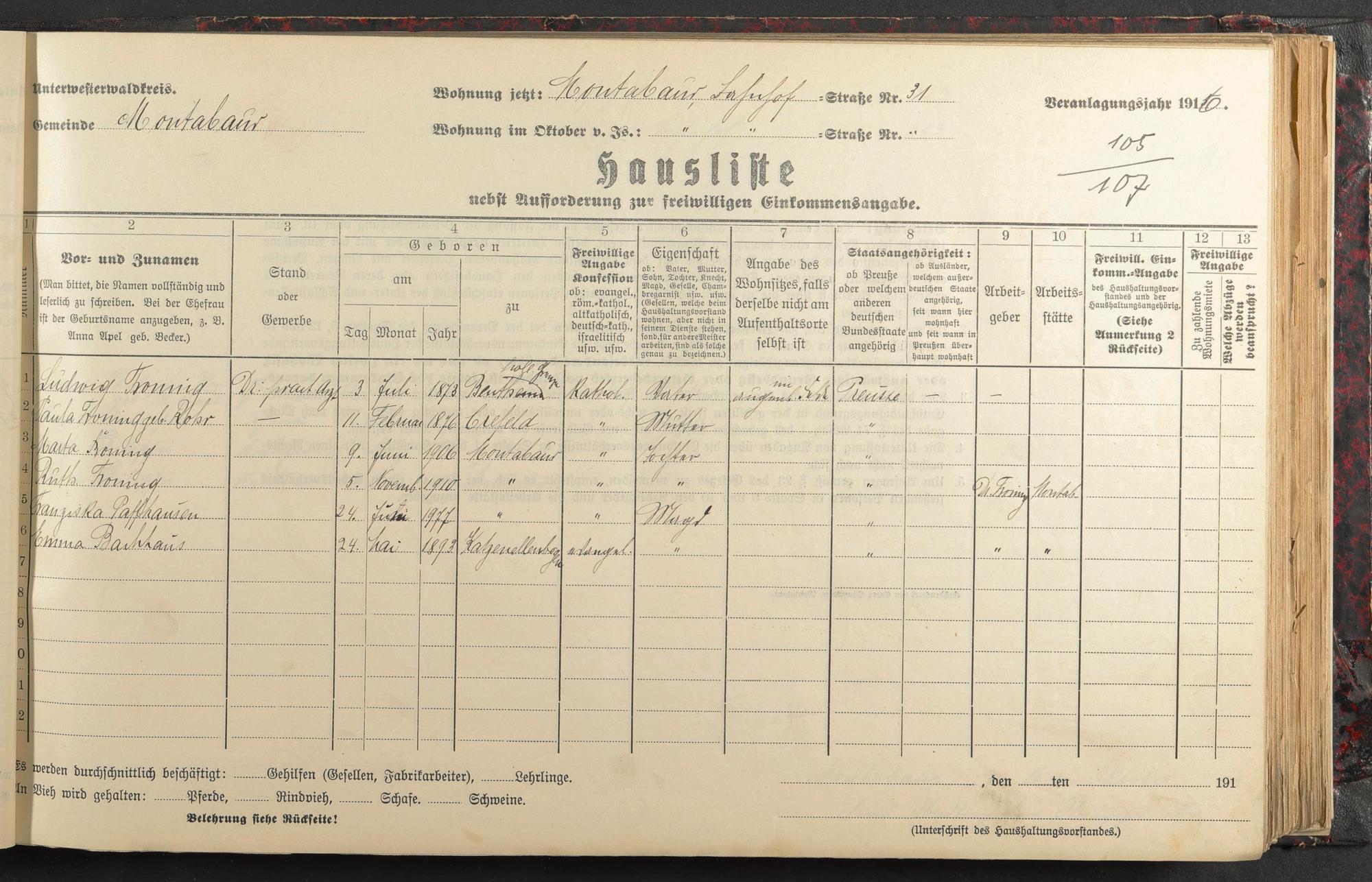 Froning, Ludwig Dr. med. Froning, Paula geb. Rohr Froning, Marta Froning, Ruth Paffhausen, Franziska Backhaus, Emma
