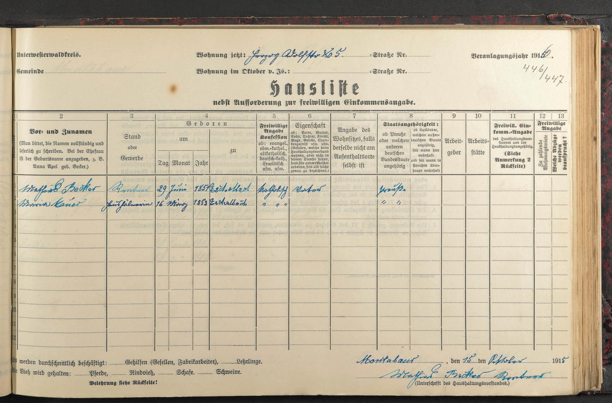 Haushaltsliste 1915/16, Kaiserstraße bis Markt