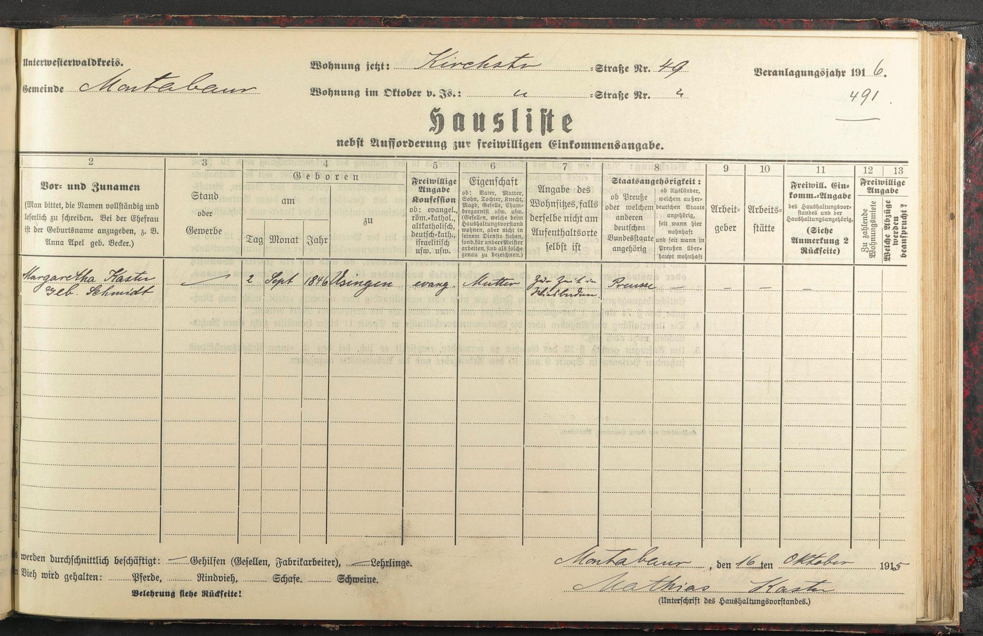 Haushaltsliste 1915/16, Kaiserstraße bis Markt