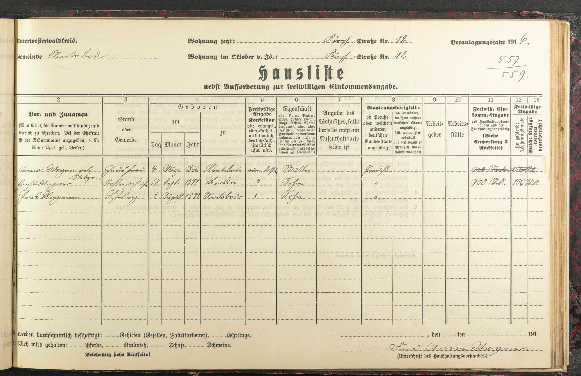 Haushaltsliste 1915/16, Kaiserstraße bis Markt