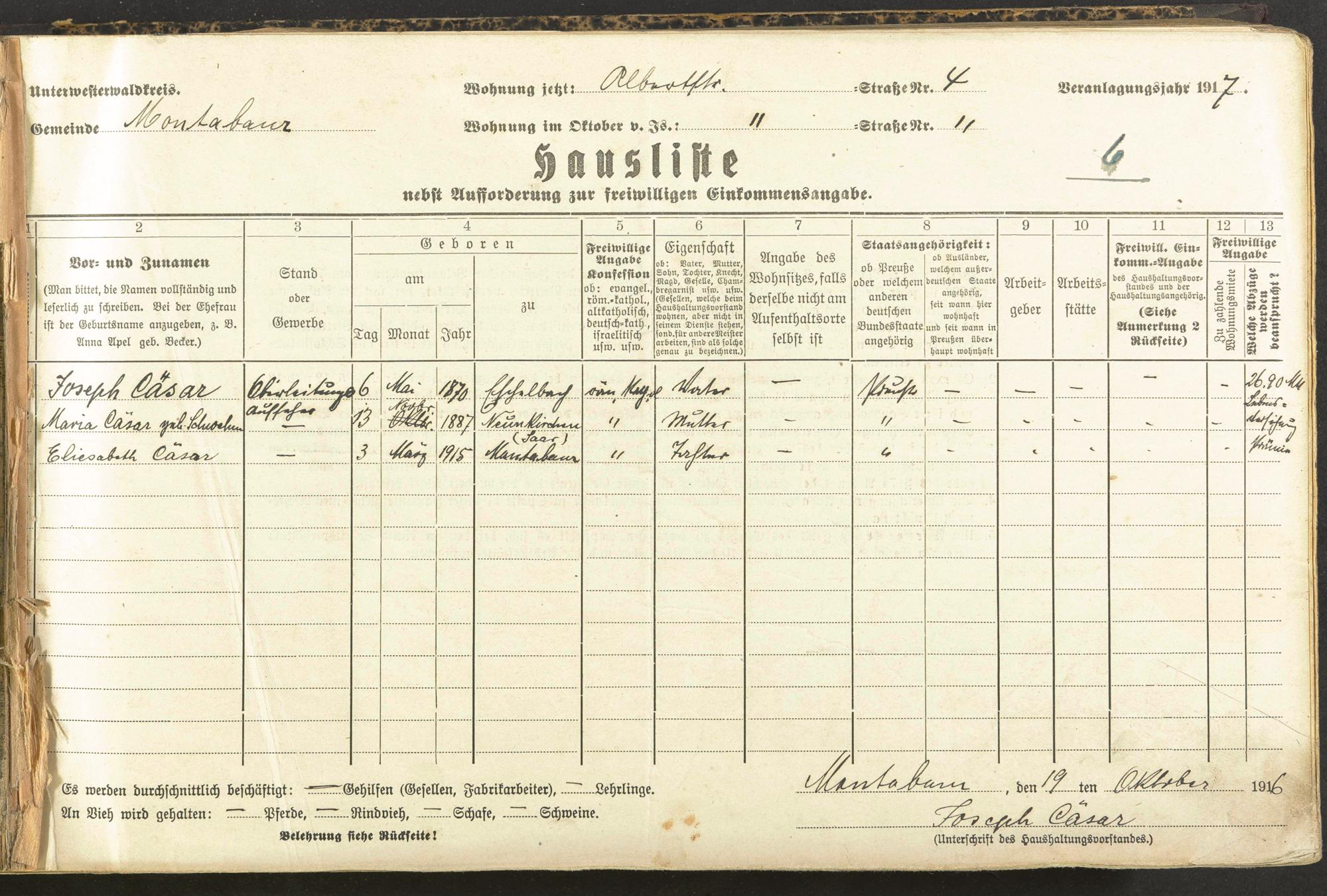 Haushaltsliste 1916/17, Kaiserstraße bis Markt