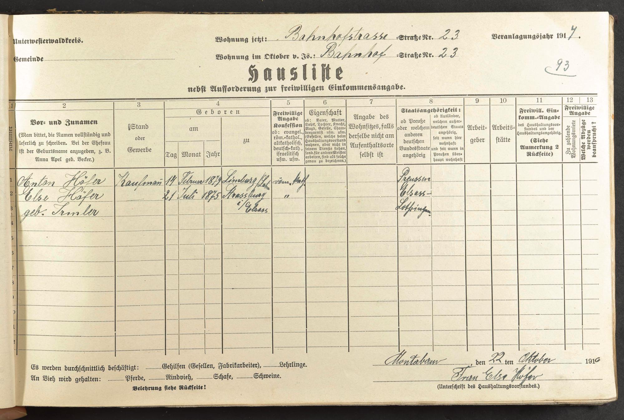 Haushaltsliste 1916/17, Kaiserstraße bis Markt