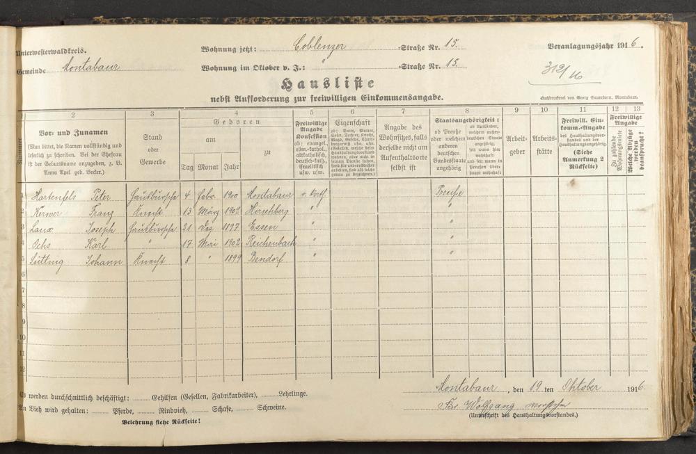 Haushaltsliste 1916/17, Coblenzer Straße bis Judengasse