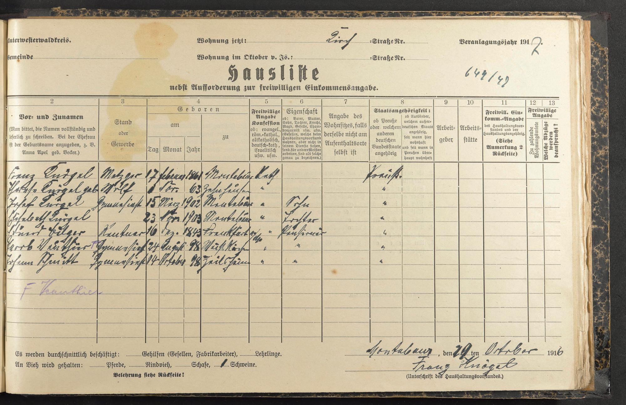 Knögel, Franz Knögel, Theresa geb. Wolf Knögel, Josef Knögel, Elisabeth Pilger, Eduard Gust. Barth. Vruthür [?], Jacob Schmitt, Johann