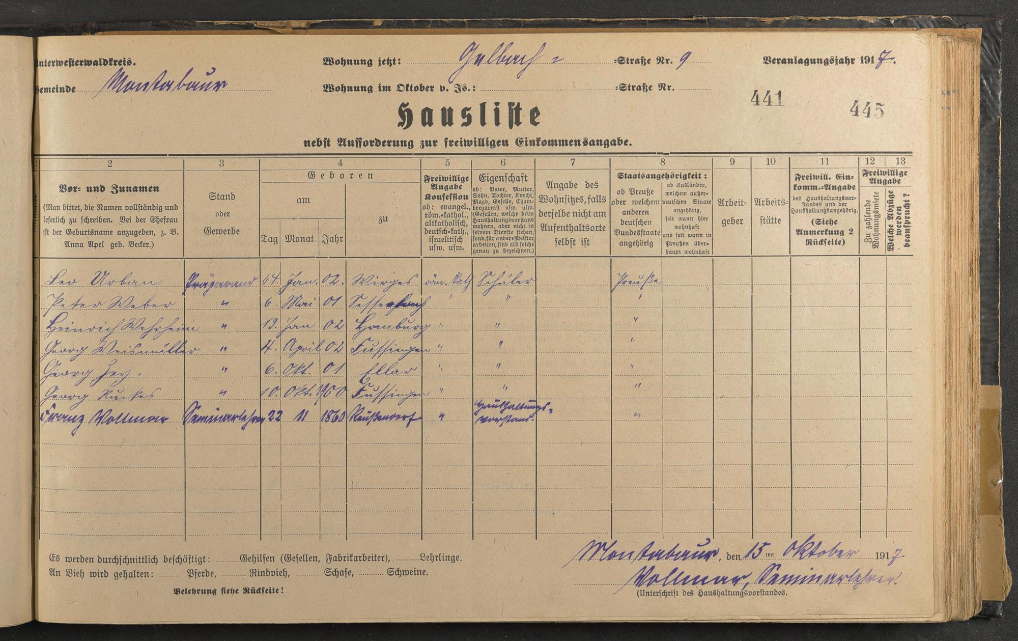 Haushaltsliste 1917/18, Kaiserstraße bis Markt