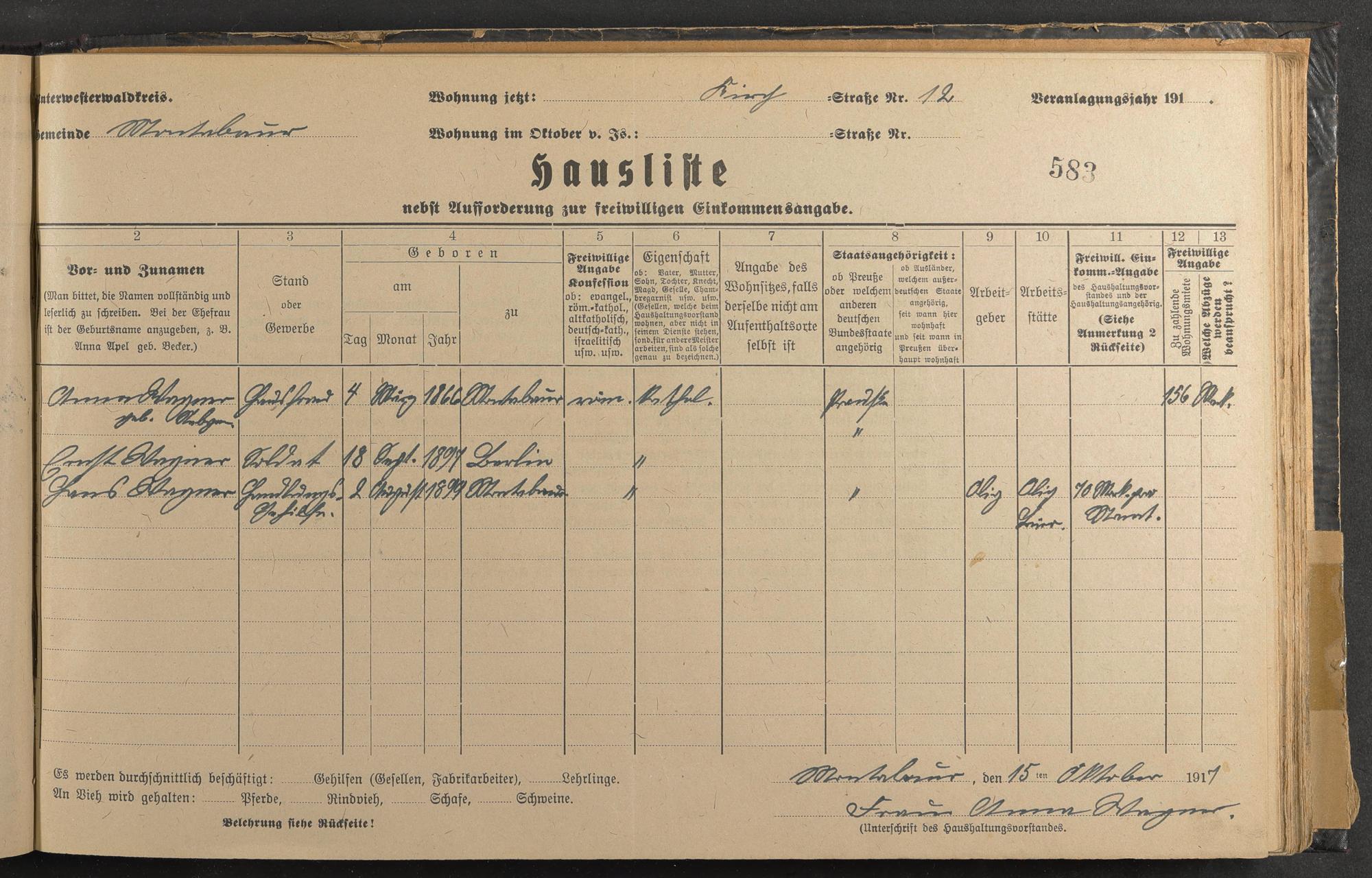 Haushaltsliste 1917/18, Kaiserstraße bis Markt