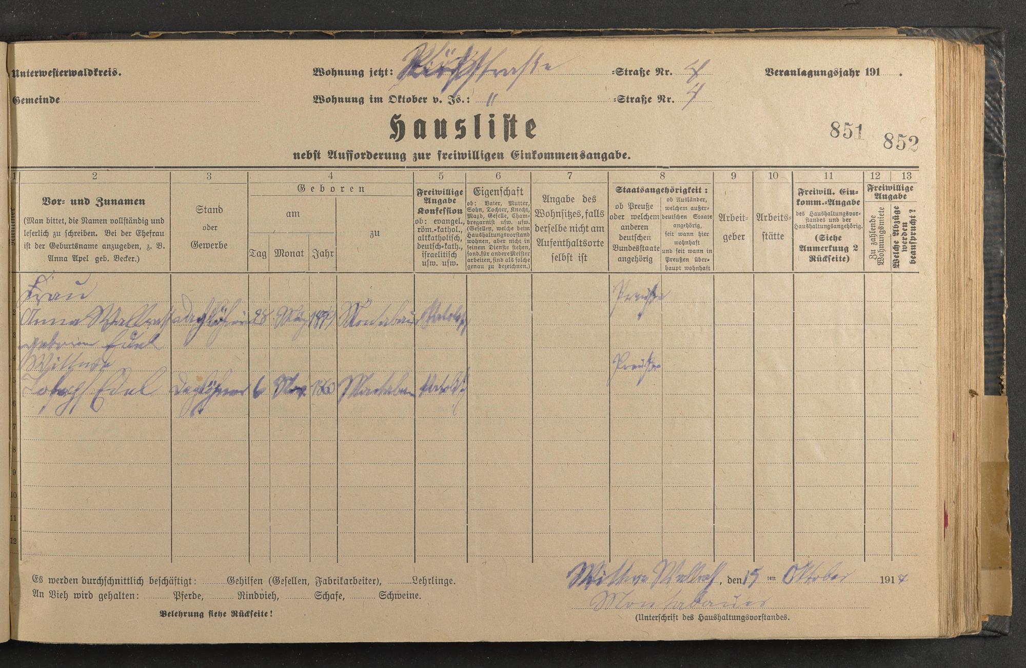 Haushaltsliste 1917/18, Sauertalstraße bis Werbhausgasse sowie Mühlen