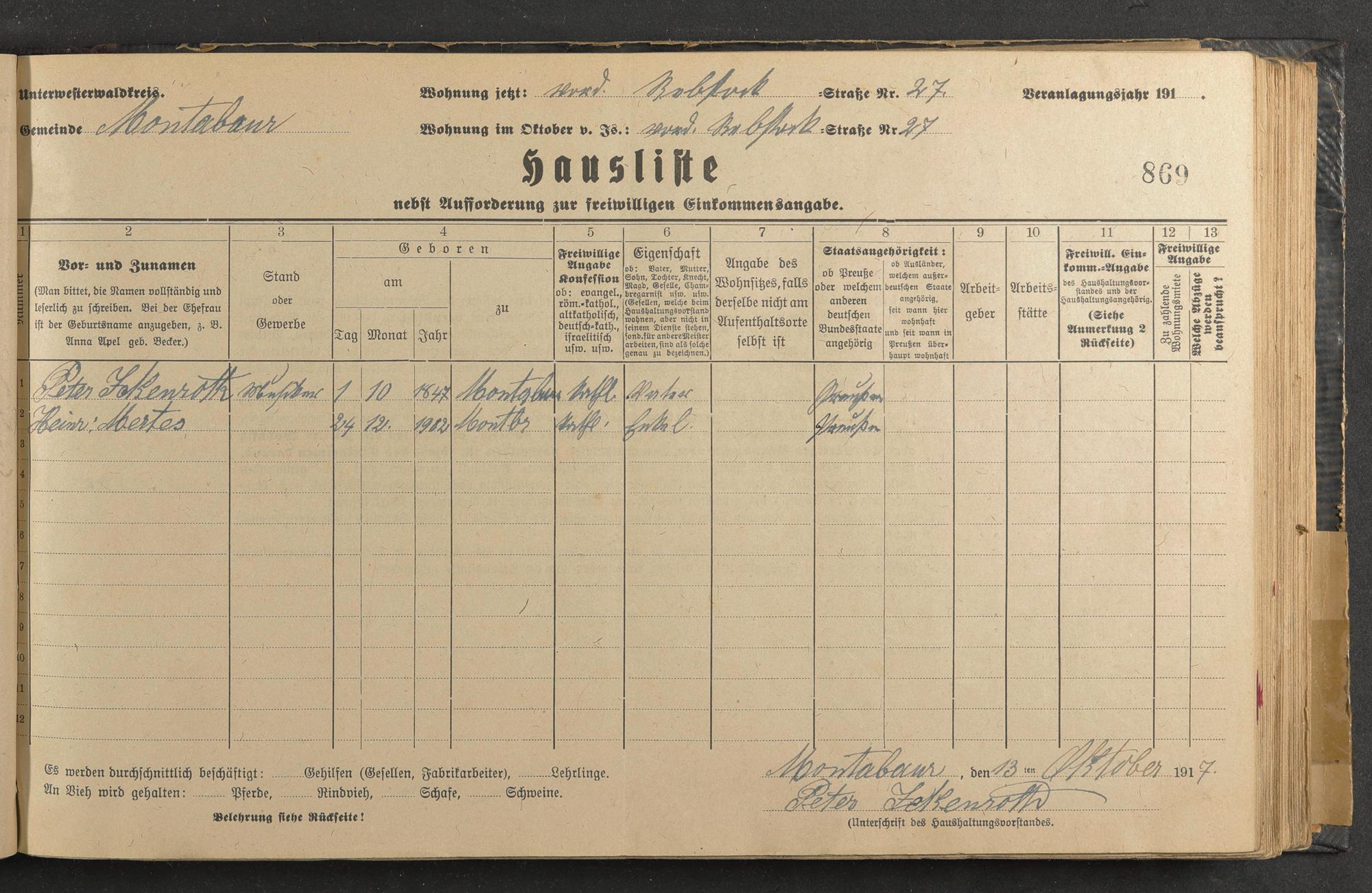 Haushaltsliste 1917/18, Sauertalstraße bis Werbhausgasse sowie Mühlen