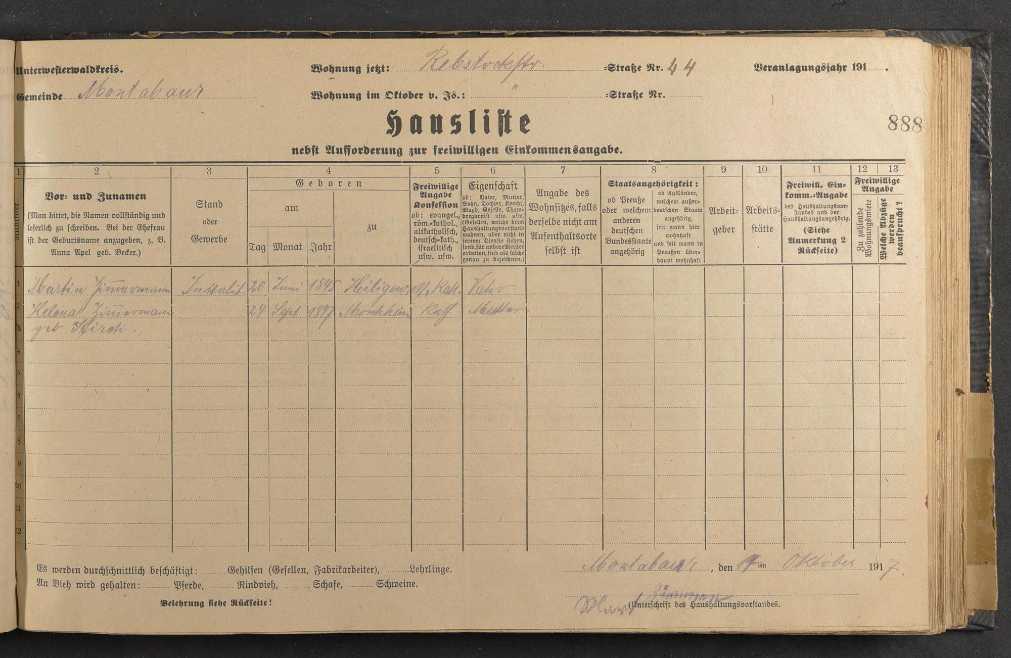 Haushaltsliste 1917/18, Sauertalstraße bis Werbhausgasse sowie Mühlen