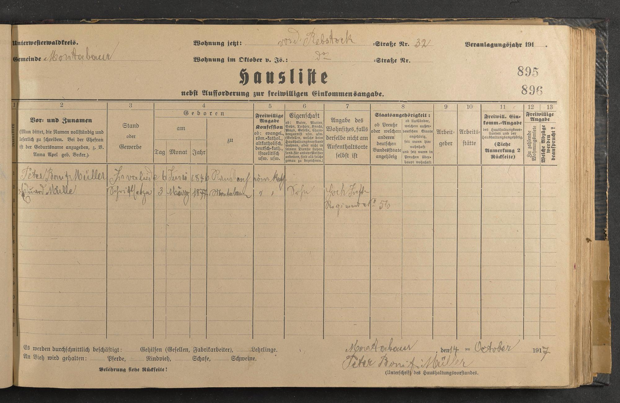 Haushaltsliste 1917/18, Sauertalstraße bis Werbhausgasse sowie Mühlen