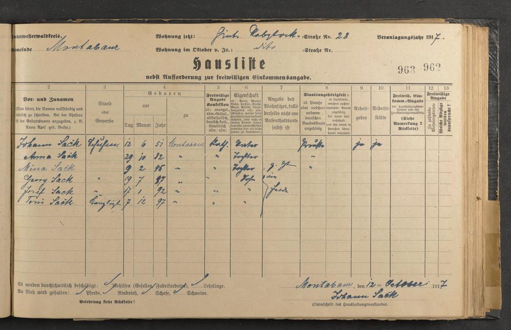 Haushaltsliste 1917/18, Sauertalstraße bis Werbhausgasse sowie Mühlen