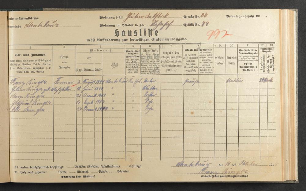 Haushaltsliste 1918, Abt. 4, A 289, Großer Markt bis Marauer Mühle