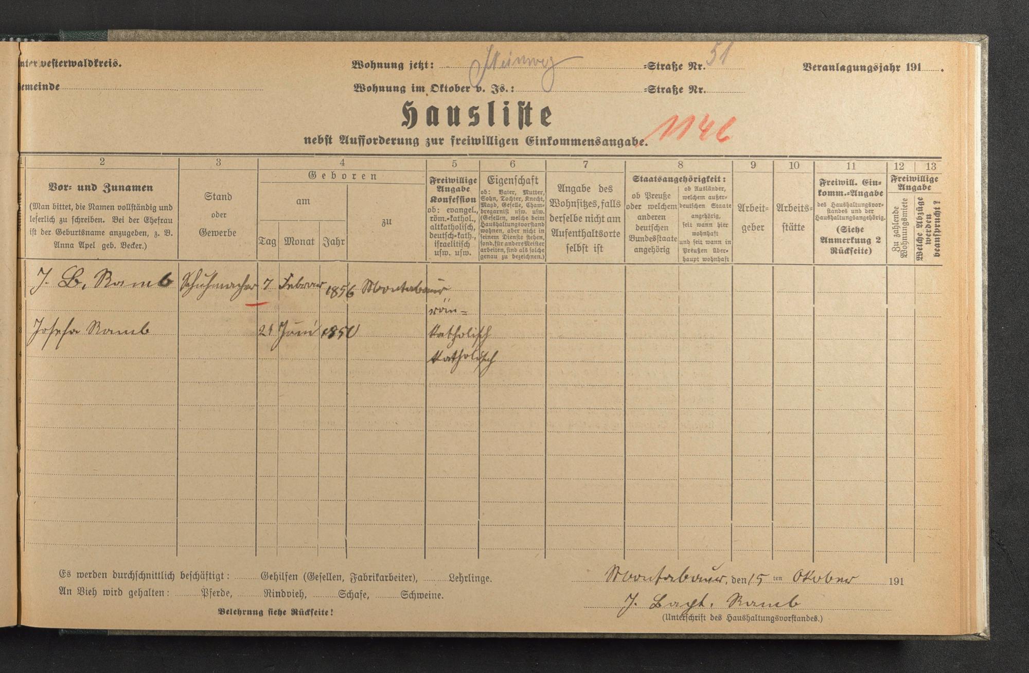 Haushaltsliste 1918, Sauertalstraße bis Werbhausgasse sowie Mühlen