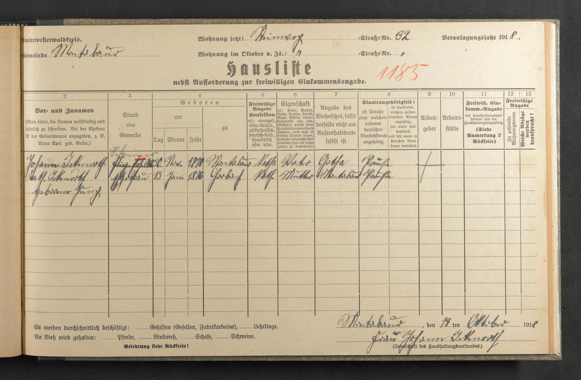 Haushaltsliste 1918, Abt. 4, A 289, Großer Markt bis Marauer Mühle