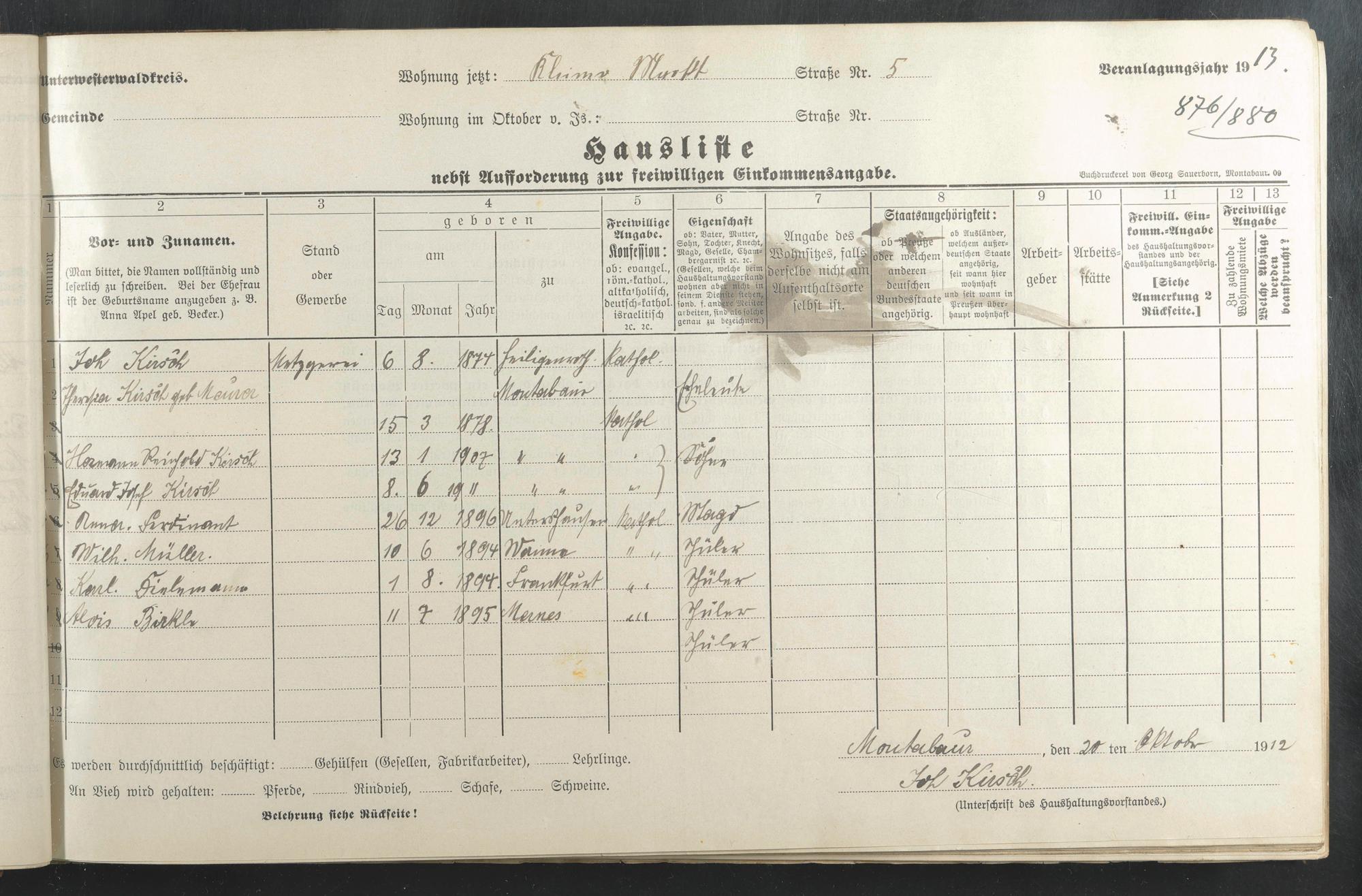 Kirsch, Johann Kirsch, Therese geb. Meurer Kirsch, Hermann Reinhold Ferdinand, Anna Müller, Wilhelm Dielemann, Karl Birkle, Alois