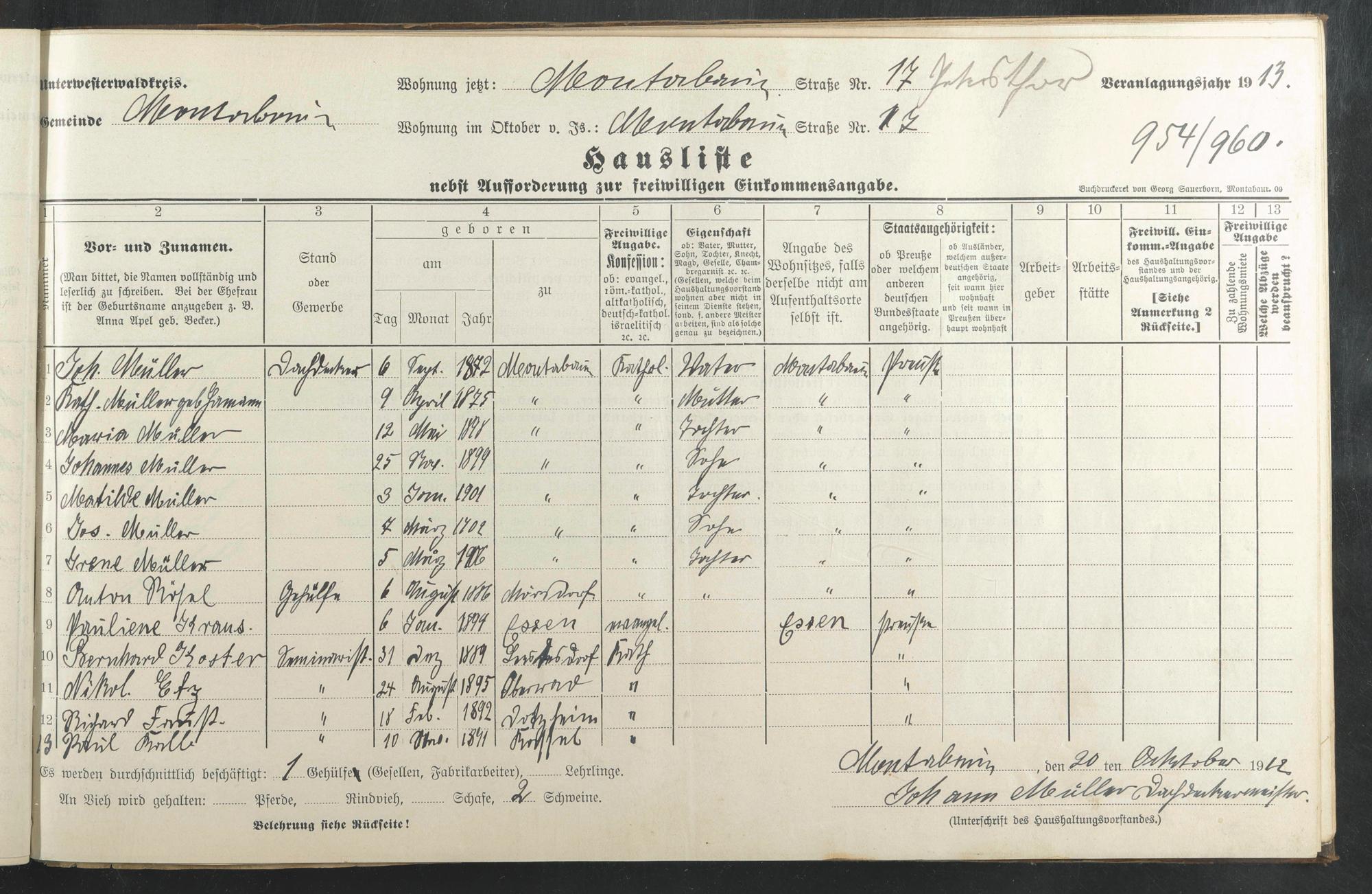 Müller, Johann Müller, Katharina geb. Hamann Müller, Maria Müller, Johannes Müller, Mathilde Müller, Josef Müller, Irene Rössel, Anton Kraus, Pauline Koster, B. Etz, Nikolaus Früst [?], Richard