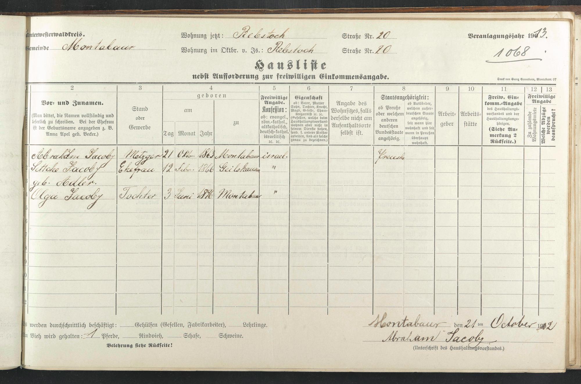 Haushaltsliste 1912/13, Sauertalstraße bis Werbhausgasse sowie Mühlen