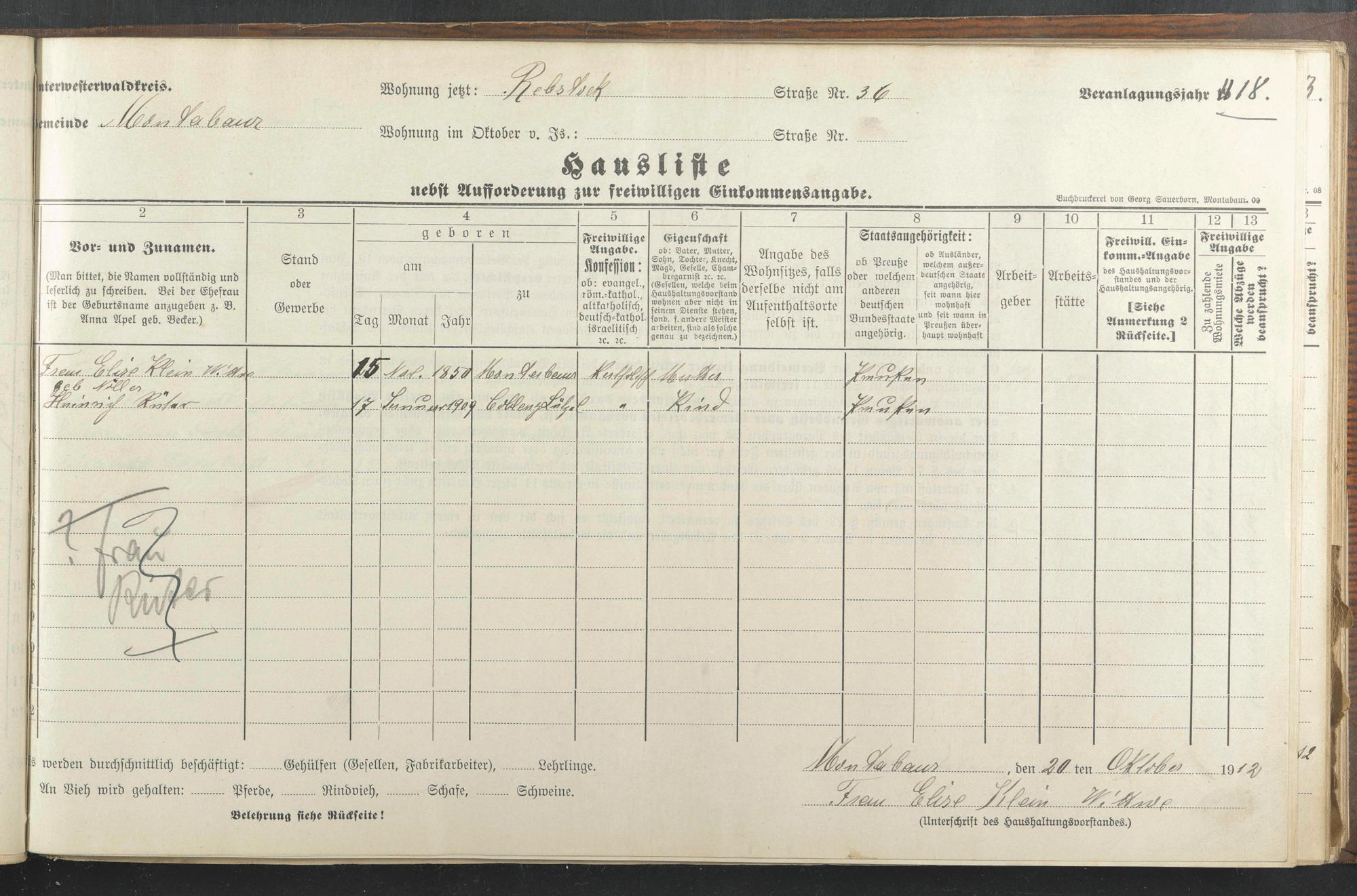 Haushaltsliste 1912/13, Sauertalstraße bis Werbhausgasse sowie Mühlen