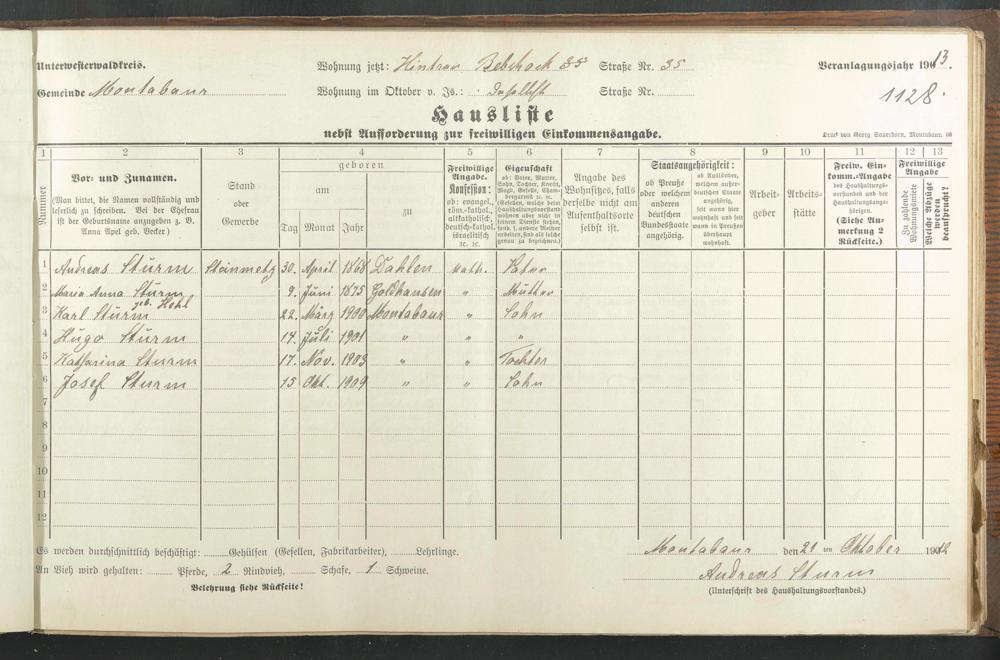 Haushaltsliste 1912/13, Sauertalstraße bis Werbhausgasse sowie Mühlen