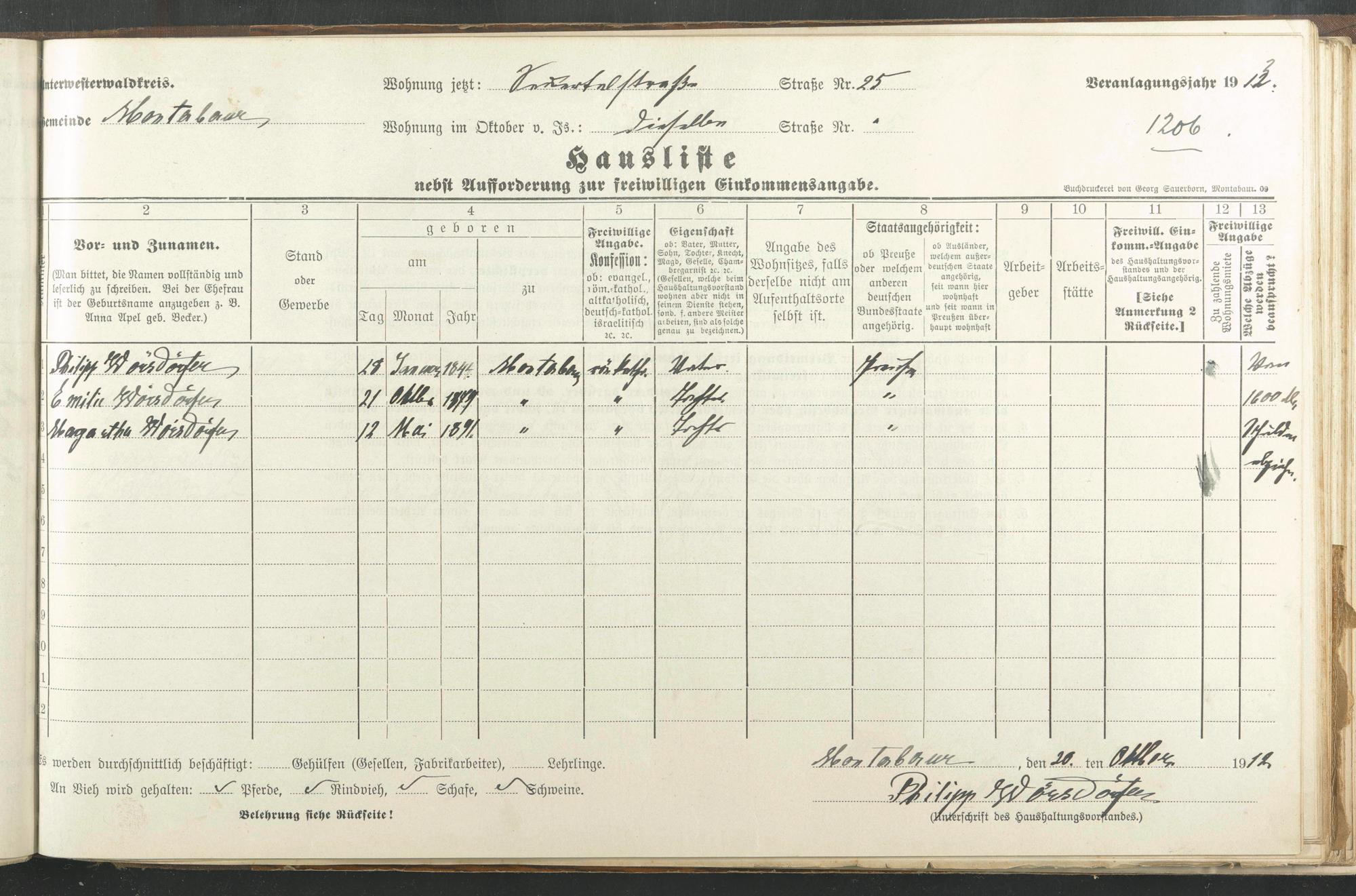 Haushaltsliste 1912/13, Sauertalstraße bis Werbhausgasse sowie Mühlen