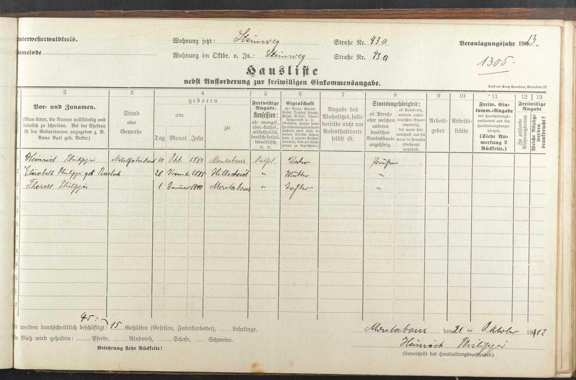 Haushaltsliste 1912/13, Sauertalstraße bis Werbhausgasse sowie Mühlen