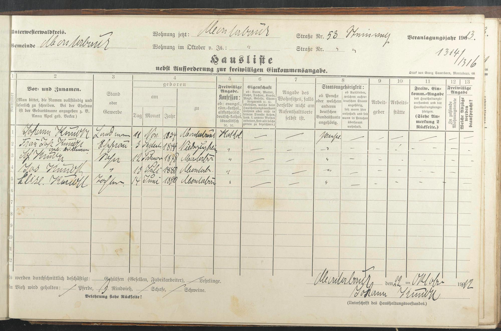 Haushaltsliste 1912/13, Sauertalstraße bis Werbhausgasse sowie Mühlen