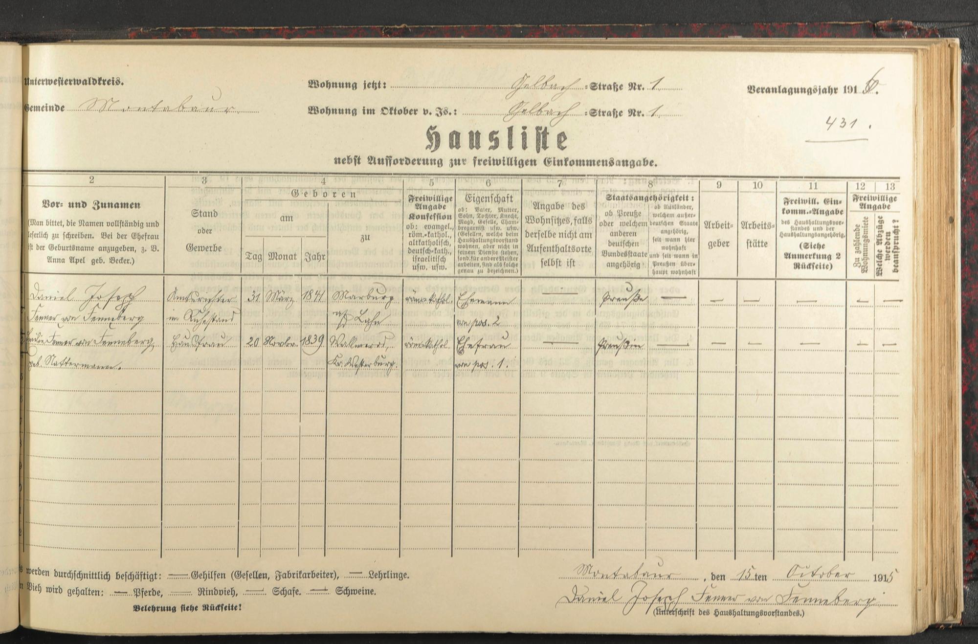 Haushaltsliste 1915/16, Kaiserstraße bis Markt