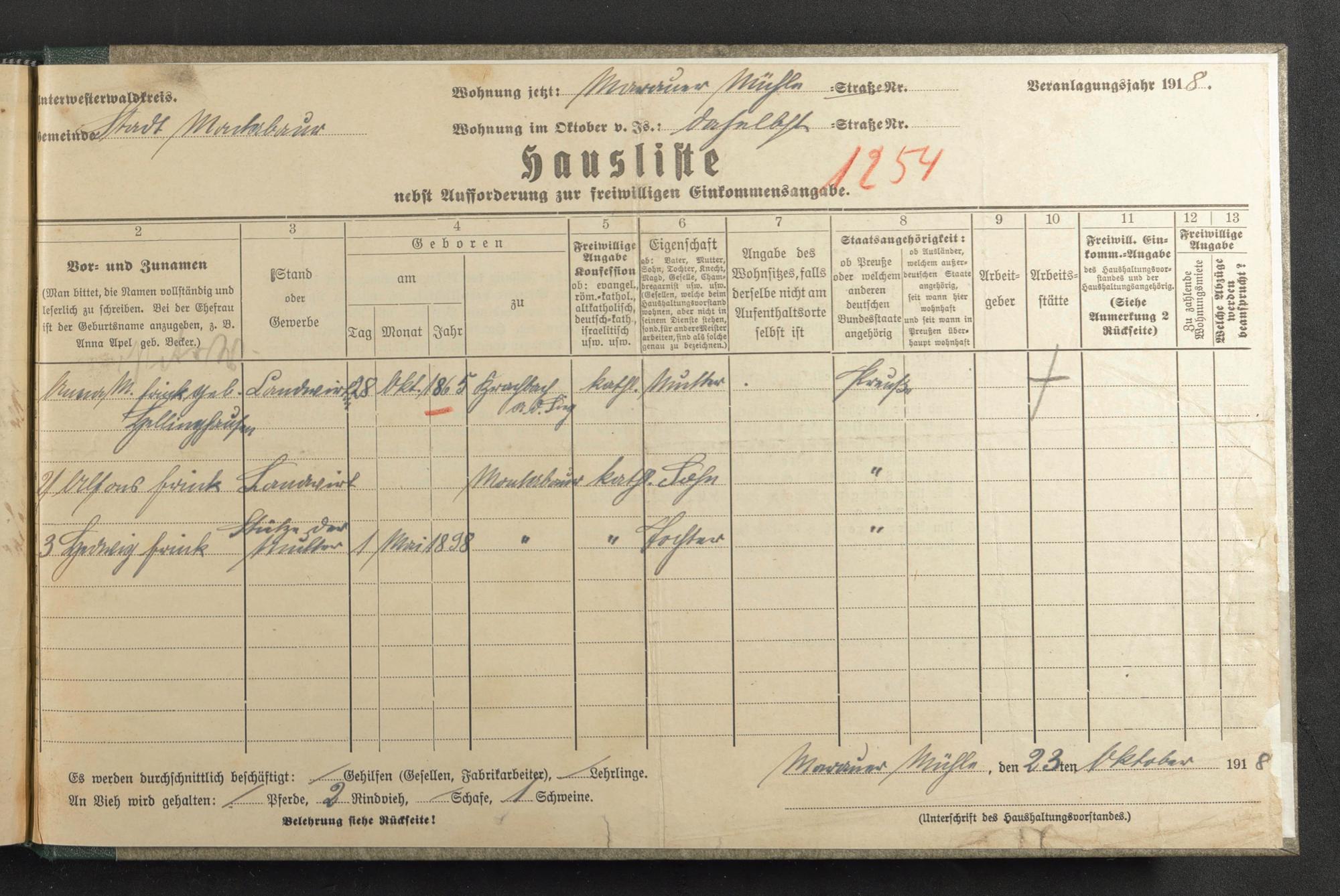 Haushaltsliste 1918, Sauertalstraße bis Werbhausgasse sowie Mühlen