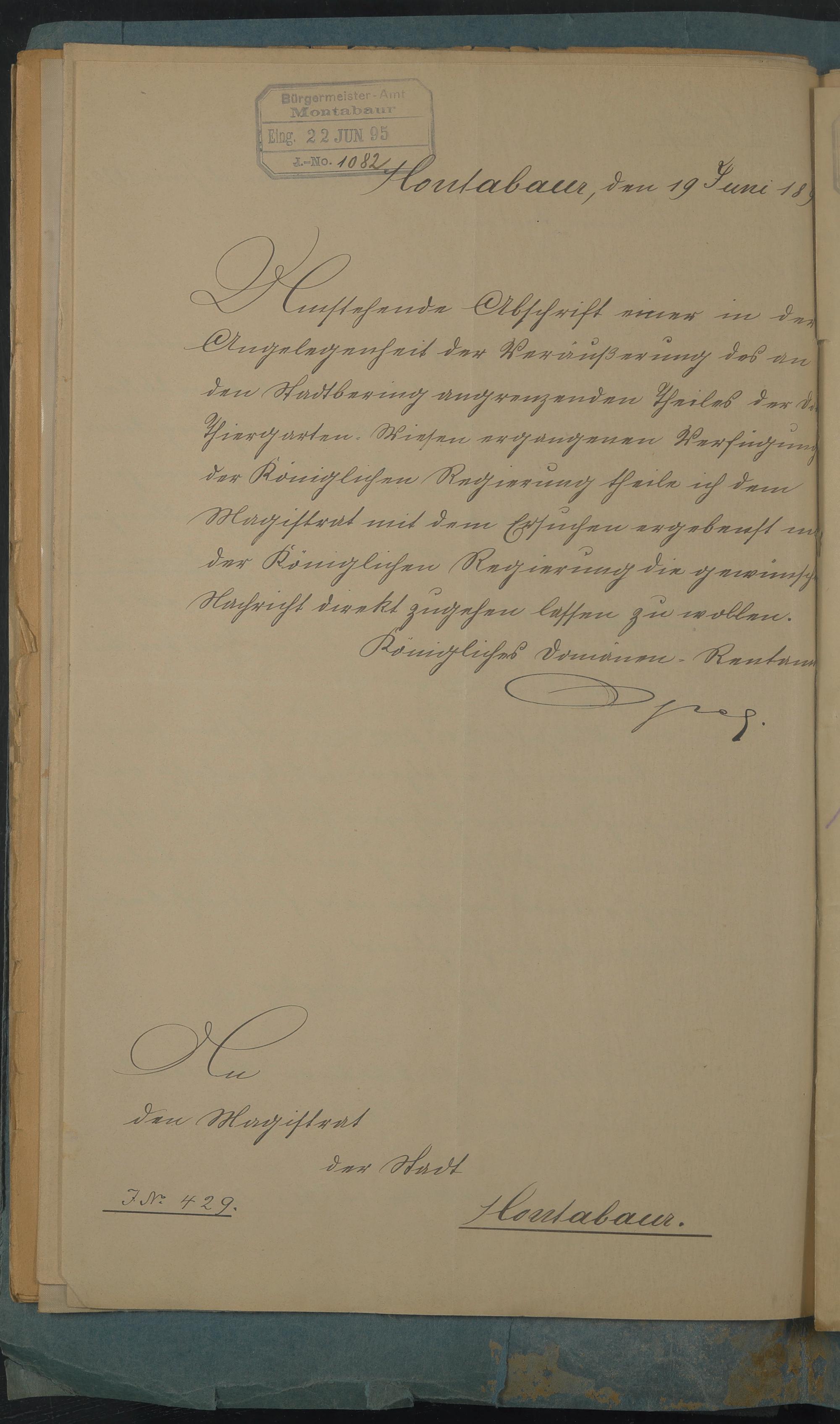 Urkunde zum Vertrag zwischen der Stadtgemeinde Montabaur und dem Domänenrentenamt