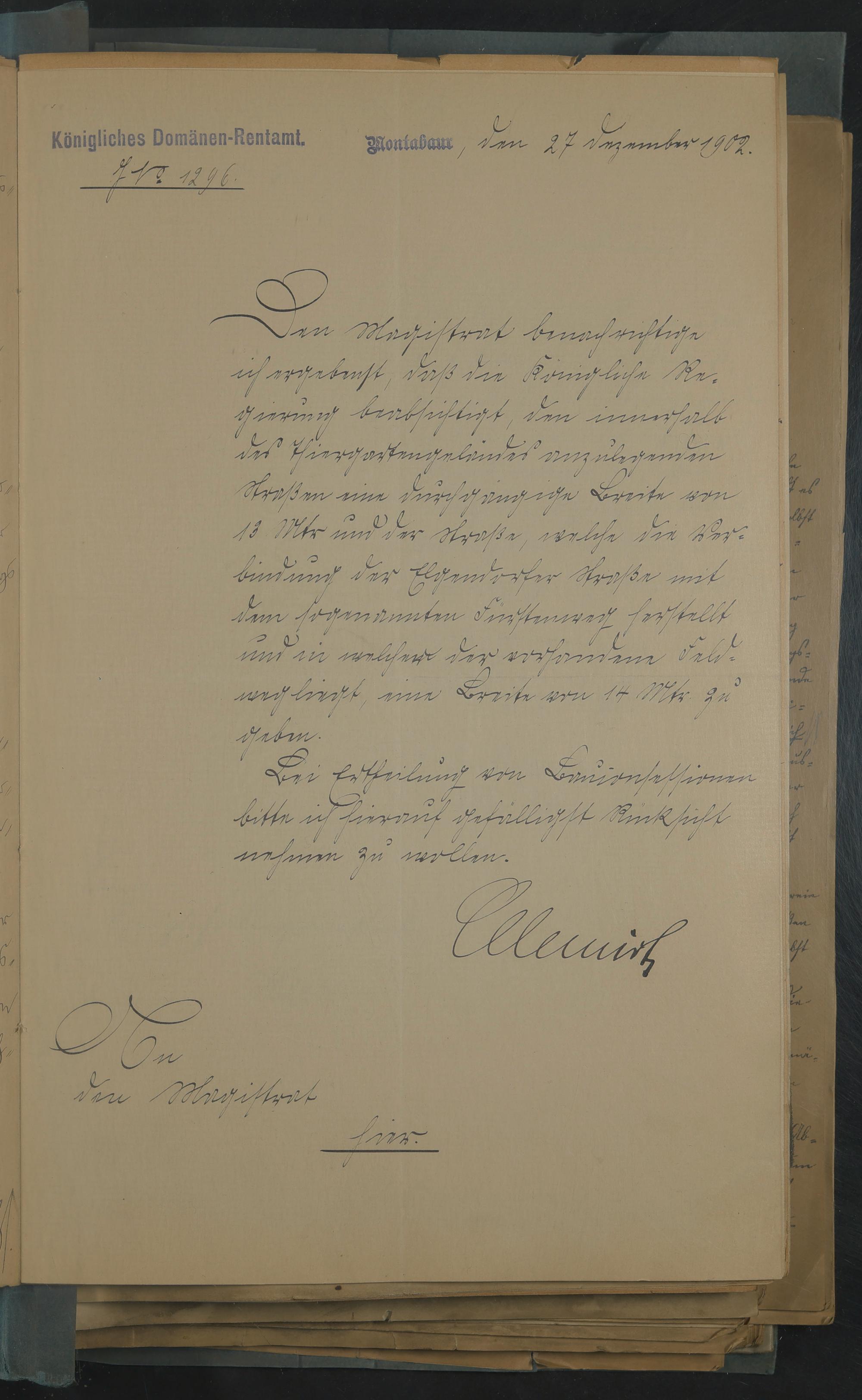 Urkunde zum Vertrag zwischen der Stadtgemeinde Montabaur und dem Domänenrentenamt