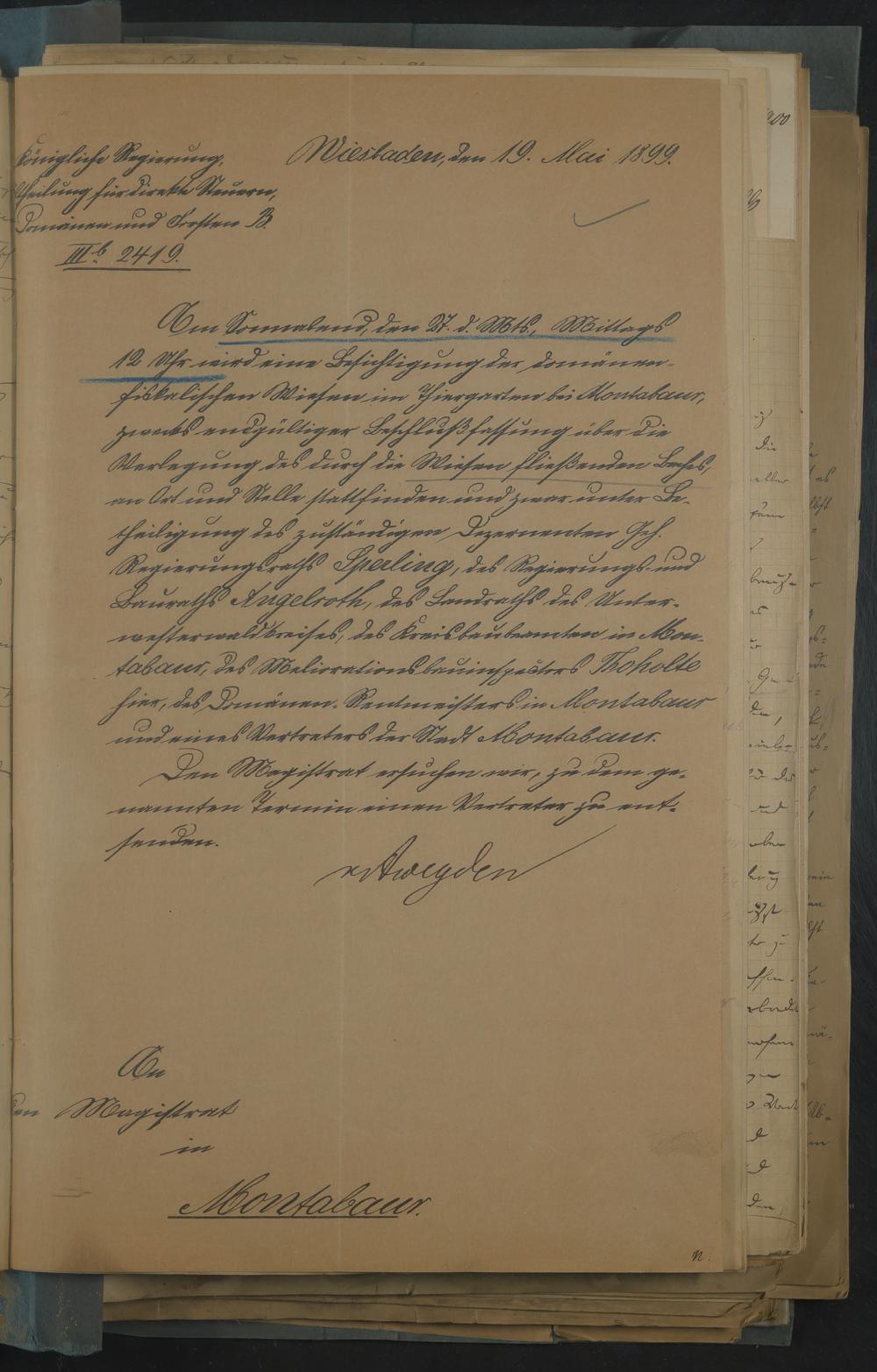 Urkunde zum Vertrag zwischen der Stadtgemeinde Montabaur und dem Domänenrentenamt