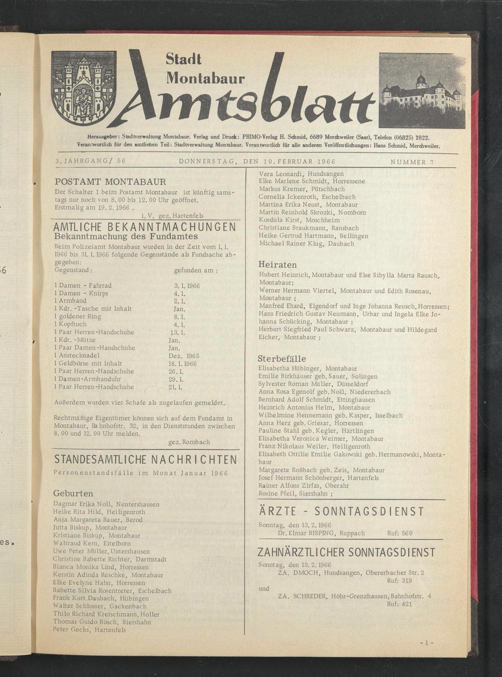 Beim Polizeiamt Montabaur wurden in der Zeit vom 1.1. 1966 bis 31. 1,1966 folgende Gegenstände als Fundsache abgegeben: