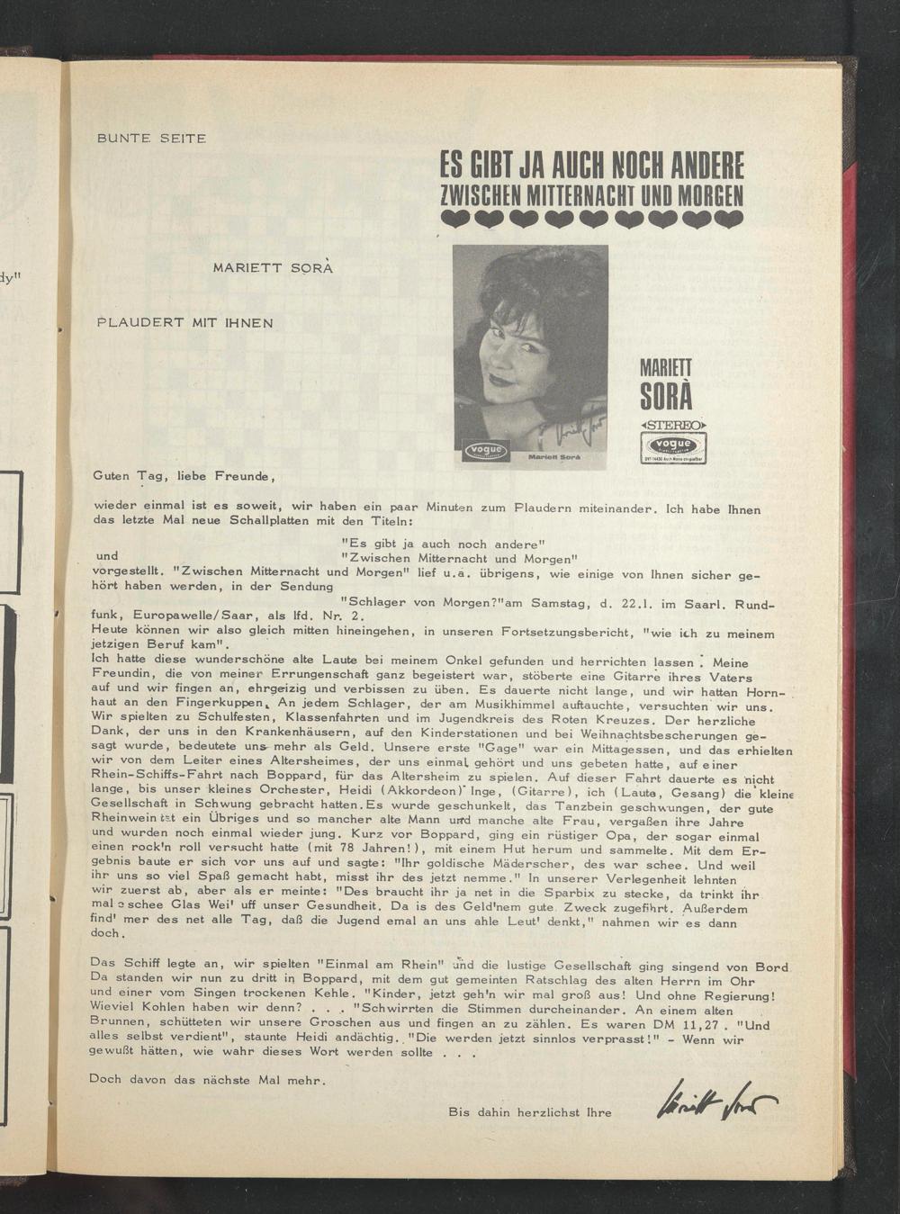 "Schlager von Morgen?"am Samstag, d. 22.1. im Saarl. Rundfunk, Europa welle/Saar, als lfd. Nr. 2.