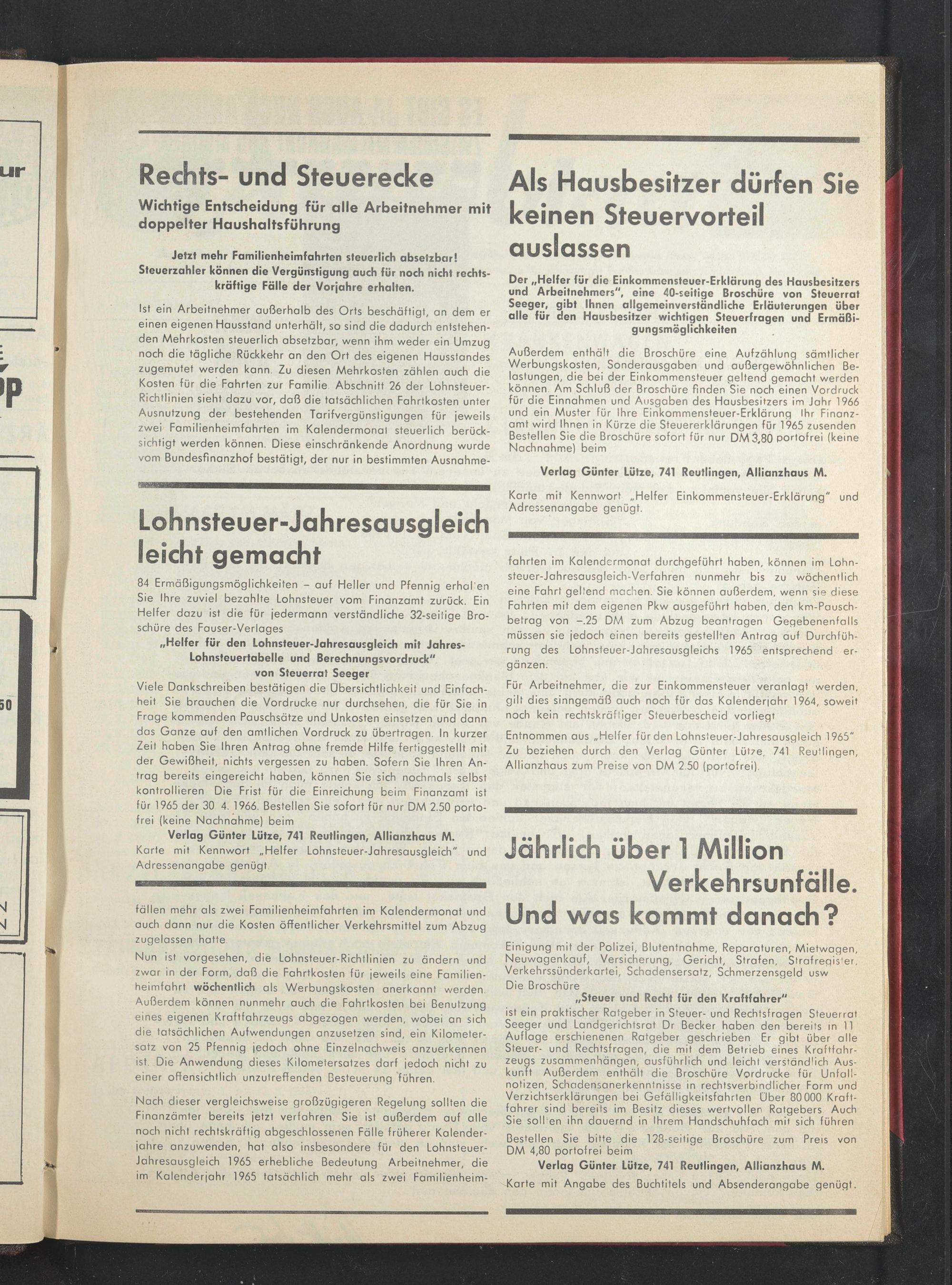Entnommen aus „Helfer für den Lohnsteuer-Jahresausgleich 1965" Zu beziehen durch den Verlag Günter Lütze. 741 Reutlingen, Allianzhaus zum Preise von DM 2.50 (portofrei).