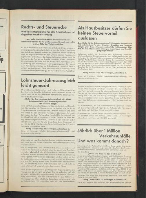 Außerdem enthält die Broschüre eine Aufzählung sämtlicher Werbungskosten, Sonderausgaben und außergewöhnlichen Belastungen, die bei der Einkommensteuer geltend gemacht werden können. Am Schluß der Broschüre finden Sie noch einen Vordruck für die Einnahmen und Ausgaben des Hausbesitzers im Jahr 1966 und ein Muster für Ihre Einkommensteuer-Erklärung Ihr Finanzamt wird Ihnen in Kürze die Steuererklärungen für 1965 zusenden Bestellen Sie die Broschüre sofort für nur DM3,80 portofrei (keine Nachnahme) beim