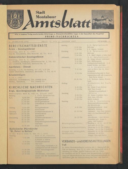 Samstag, .7.1. 67, bis Samstag, 14.1.67, 2. 00 Uhr AMTS-APOTHEKE, Montabaur, Bahnhofstr. 9, Tel. 82 06