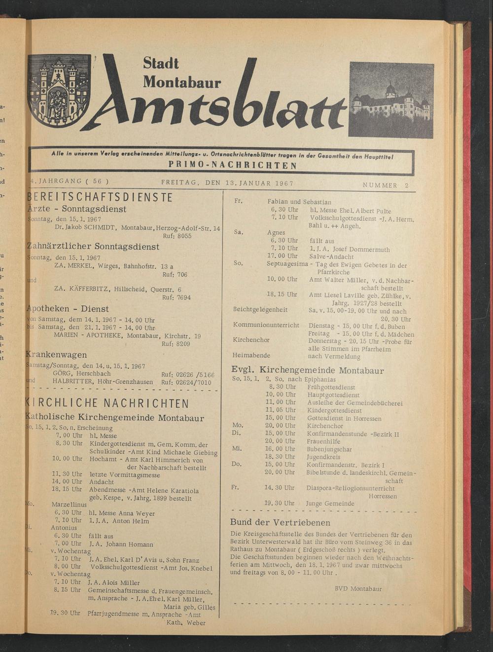 Die Kreisgeschäftsstelle des Bundes der Vertriebenen für den Bezirk Unterwesterwald hat ihr Büro vom Steinweg 36 in das Rathaus zu Montabaur ( Erdgeschoß rechts ) verlegt.