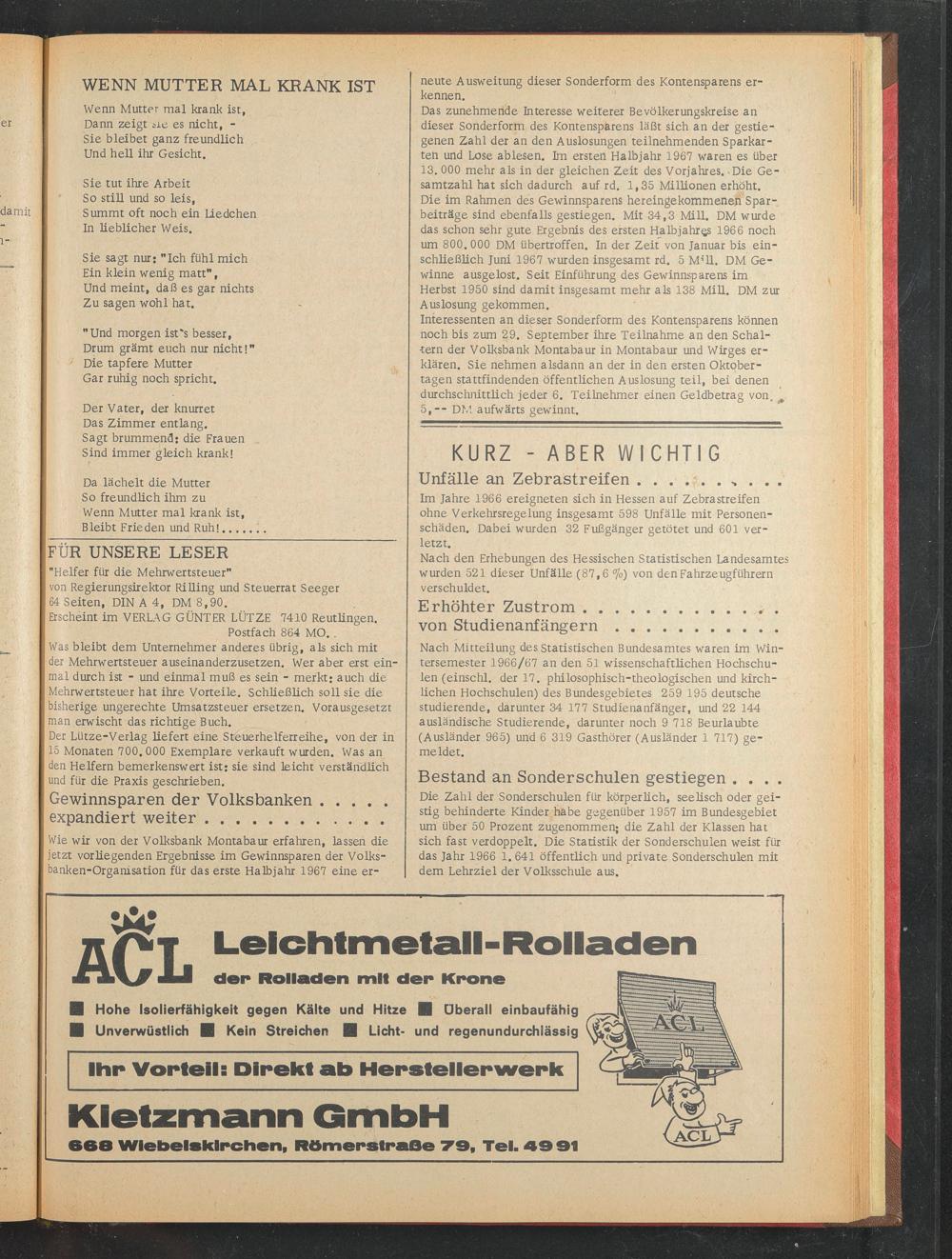 Wie wir von der Volksbank Montabaur erfahren, lassen die jetzt vorliegenden Ergebnisse im Gewinnsparen der Volks- banken-Organisation für das erste Halbjahr 1967 eine er