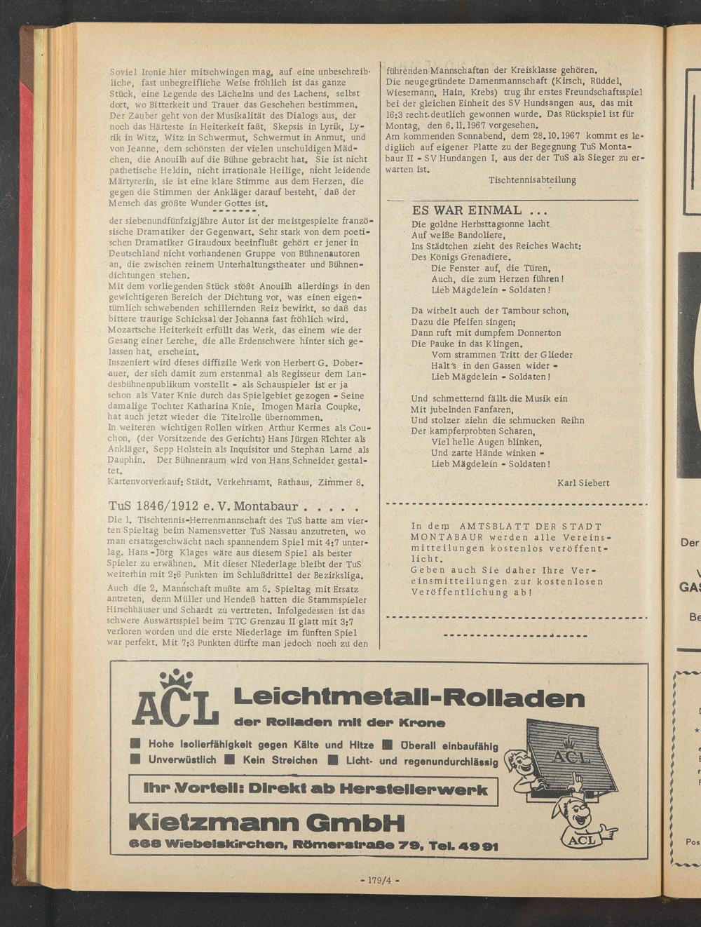 Am kommenden Sonnabend, dem 28.10.1967 kommt es lediglich auf eigener Platte zu der Begegnung TuS Montabaur II - SV Hundangen I, aus der der TuS als Sieger zu erwarten ist.