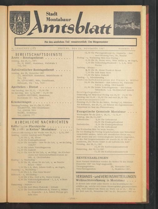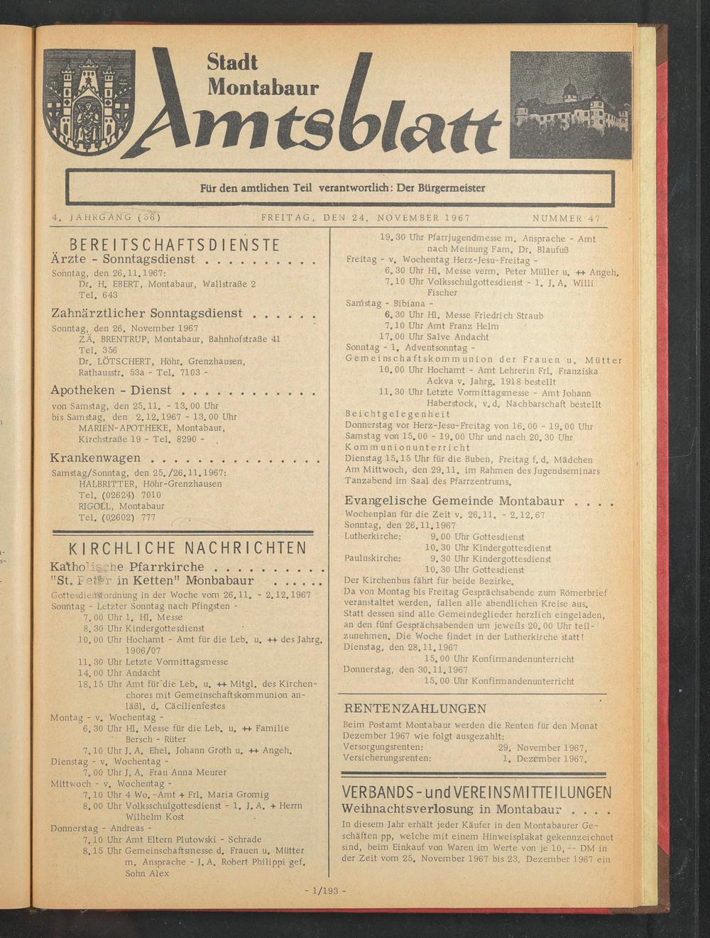 Samstag/Sonntag, den 25./26.11.1967: HALBRITTER, Höhr-Grenzhausen Tel. (02624) 7010 RIGOLL, Montabaur Tel. (0.2602) 777