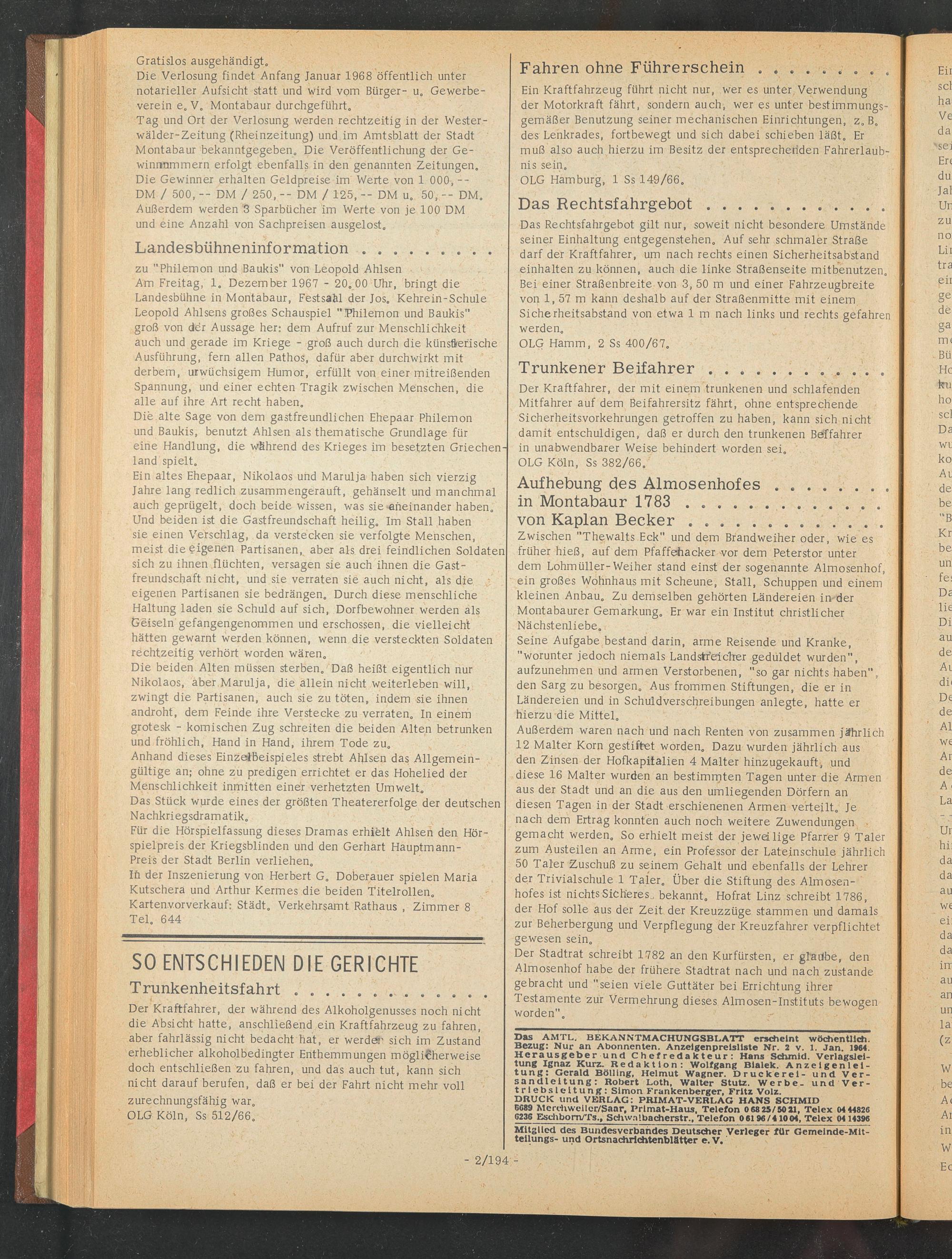 Die Verlosung findet Anfang Januar 1968 öffentlich unter notarieller Aufsicht statt und wird vom Bürger- u, Gewerbeverein e„ V. Montabaur durchgeführt,,