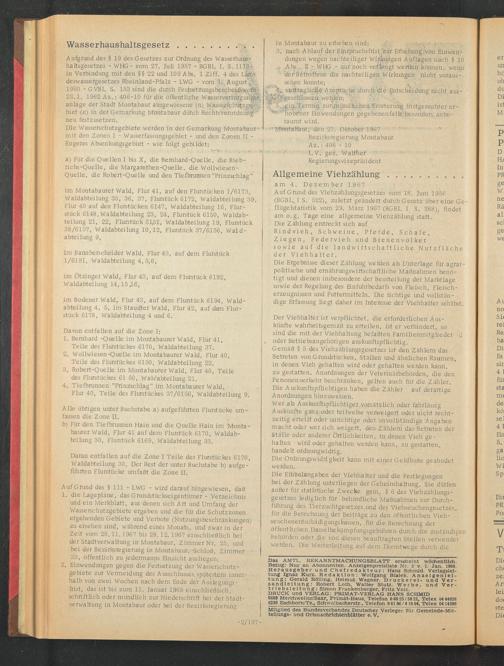 1. die Lagepläne, das Grundstückseigentümer - Verzeichnis und ein Merkblatt, aus denen sich Art und Umfang der Wasserschutzgebiete ergeben und die für die Schutzzonen ergehenden Gebiete und Verbote (Nutzungsbeschränkungen) zu ersehen sind, während eines Monats, und zwar in der Zeit vom 28.11.1967 bis 28.12. 1967 einschließlich bei der Stadtverwaltung in Montabaur, Zimmer Nr, 25, und bei der Bezirksregierung in Montabaur,- Schloß, Zimmer 33, öffentlich zu jedermanns Einsicht ausliegen;