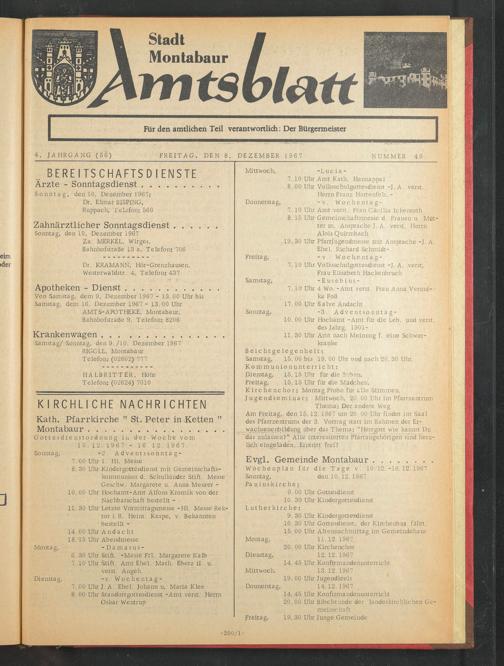 Von Samstag, dem 9, Dezember 1967 - 13. 00 Uhr bis Samstag, dem 16. Dezember 1967 - 13. 00 Uhr AMTS-APOTHEKE, Montabaur, Bahnhofstraße 9, Telefon; 8206