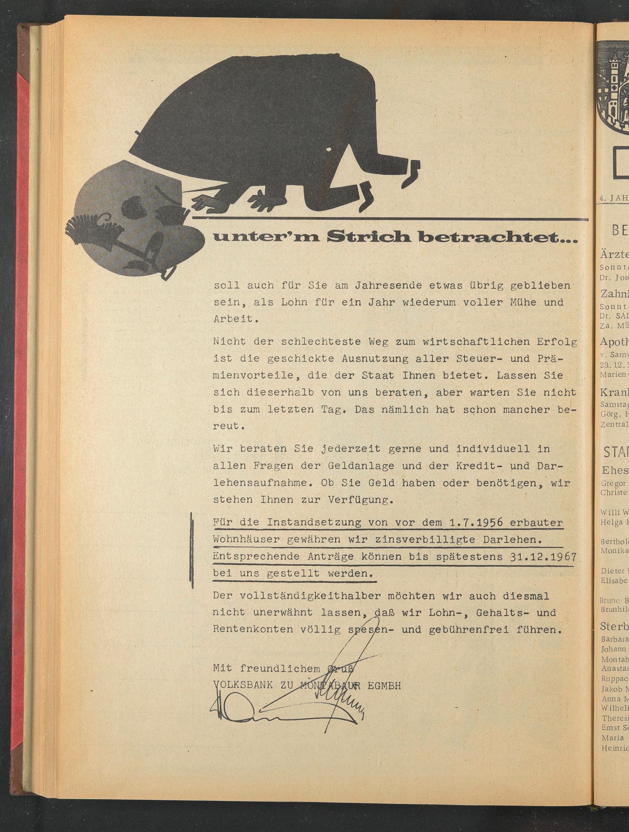 Wohnhäuser gewähren wir zinsverbilligte Darlehen. Entsprechende Anträge können bis spätestens 31*12.1967. bei uns gestellt werden.