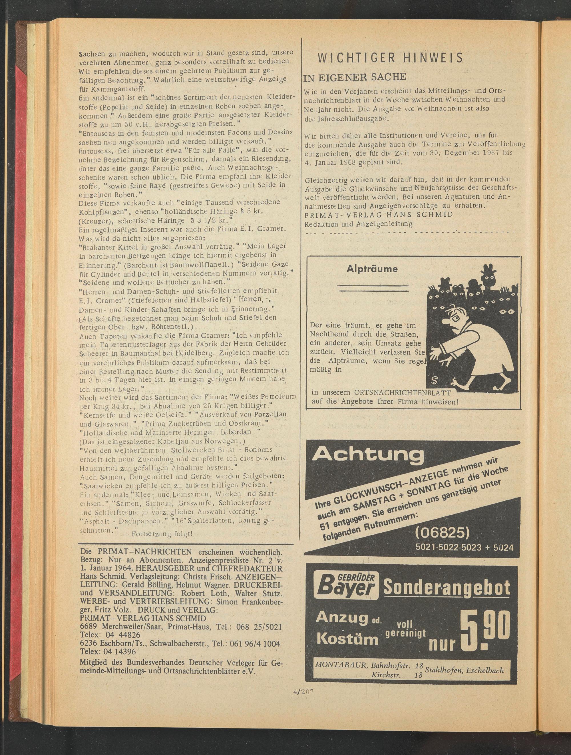 Wir bitten daher alle Institutionen und Vereine, uns für die kommende Ausgabe auch die Termine zur Veröffentlichung einzureichen, die für die Zeit vom 30. Dezember 1967 bis 4. Januar 1968 geplant sind.