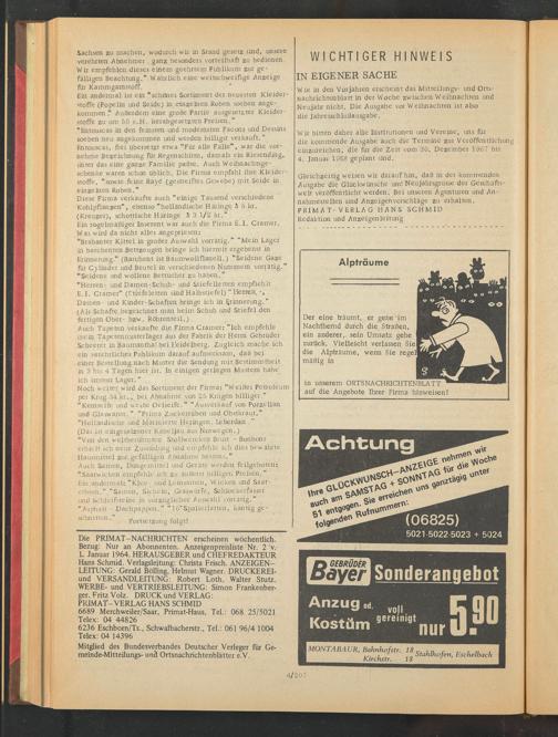 Die PRIMAT—NACHRICHTEN erscheinen wöchentlich. Bezug: Nur an Abonnenten. Anzeigenpreisliste Nr. 2 V. L Januar 1964. HERAUSGEBER und CHEFREDAKTEUR Hans Schmid. Verlagsleitung: Christa Frisch. ANZEIGEN— LEITUNG: Gerald Bölling, Helmut Wagner. DRUCKEREI- und VERSANDLEITUNG: Robert Loth, Walter Stutz. WERBE- und VERTRIEBSLEITUNG: Simon Frankenberger, Fritz Volz. DRUCK und VERLAG: