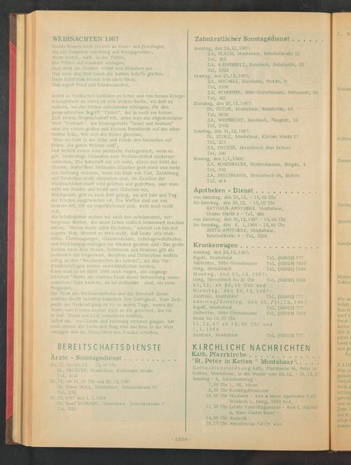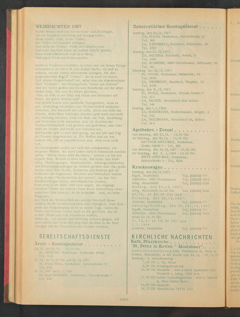 Großer Markt 8 - Tel. 426 von Samstag, den 30.12.1967 - 13. 00 Uhr bis Samstag, den 6. 1.1968 - 13. 00 Uhr AMTS-APOTHEKE, Montabaur,