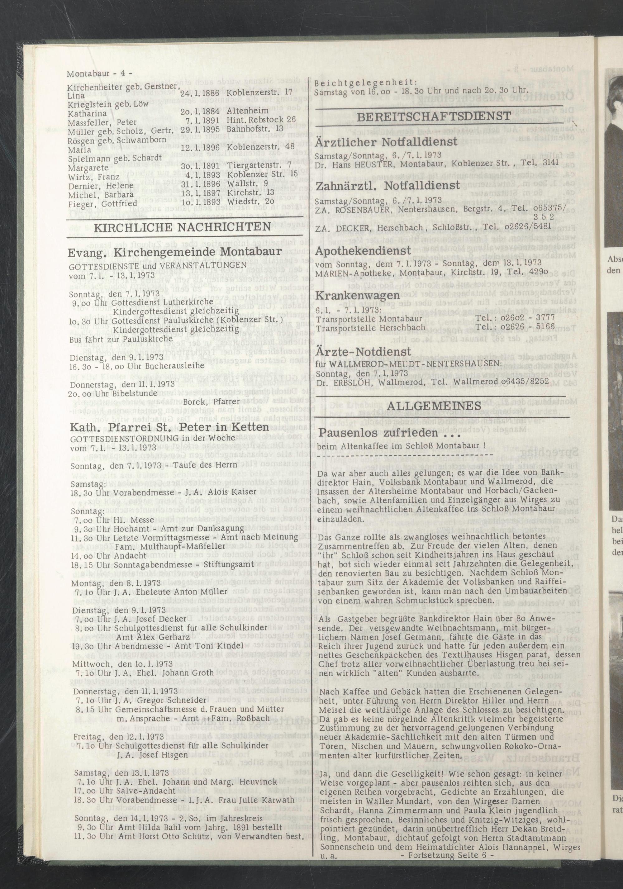 vom Sonntag, dem 7.1.1973 - Sonntag, dem 13.1.1973 MARIEN-Apotheke, Montabaur, Kirchstr. 19, Tel. 429o